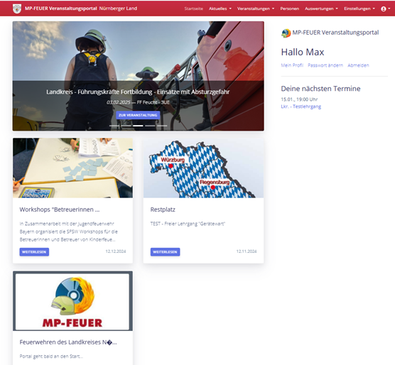 Künftig werden Ausbildungen der Feuerwehren auf Landkreisebene über das neue Veranstaltungsportal verwaltet. Die Nutzer des Portals können dabei direkt auf der Startseite des Portals aktuelle Veranstaltungen, News und Informationen zum Profil entnehmen.