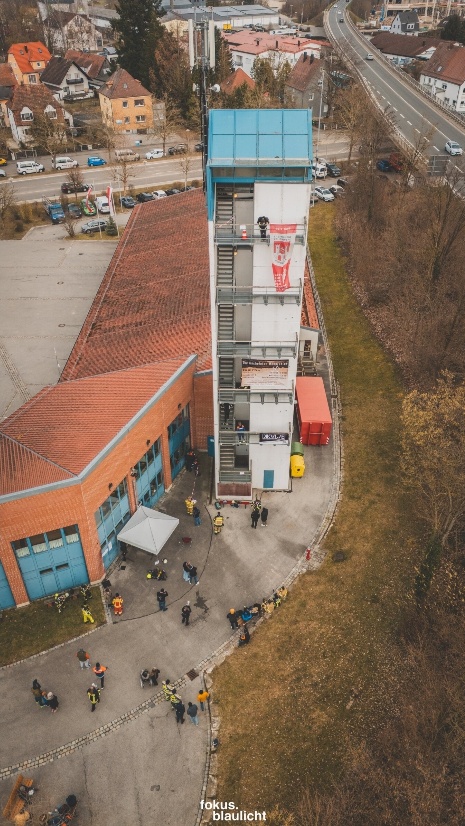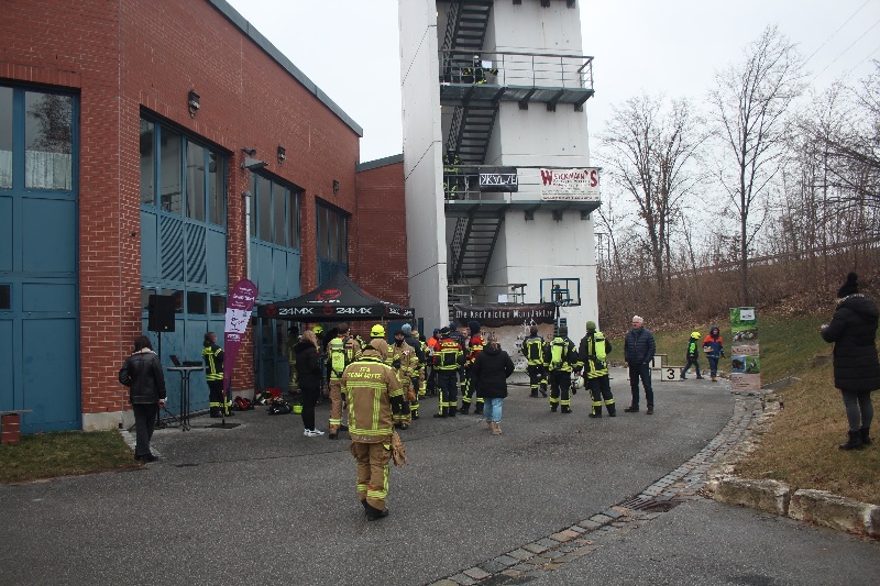 110 Stufen in voller Ausrüstung, für die Erwachsenen unter Atemschutz, die Jugend nur in Uniform, ging es 5 Mal den Schlauchturm hoch und wieder runter.