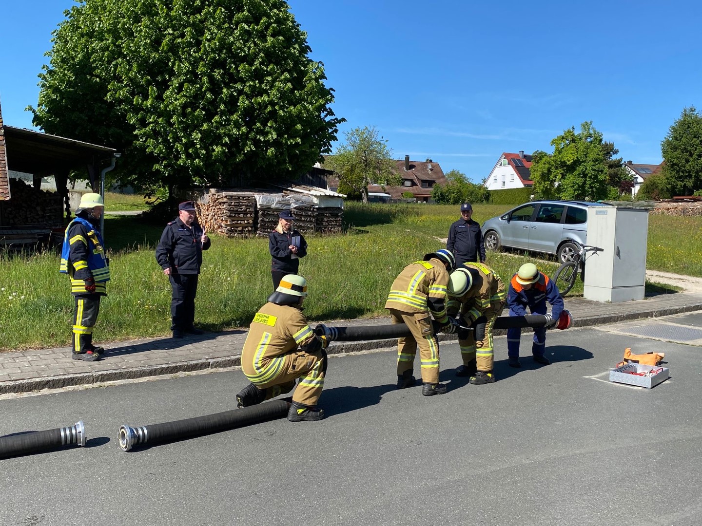 Zu Beginn der Abnahme mussten die Teilnehmer ihre Position auslosen und Zusatzaufgaben bewältigen wie Fragebogen beantworten, Gefahrenzeichen erkennen sowie Knoten und Stiche vorführen. Es folgte der anstrengende Teil der Prüfung. Angenommen wurde eine Brand in einem Nebengebäude, wobei ein Löschaufbau mit insgesamt drei C-Rohren erstellt werden musste. Der Schlauchtrupp übernahm dabei die Verkehrsabsicherung, der Wassertrupp baute die Wasserversorgung auf. Der Angriffstrupp übernahm den Erstangriff. Als letzte Aufgabe galt es für die Wasser- und Schlauchtrupps noch eine Saugleitung zu kuppeln. Nachdem beide Gruppen ihre Leistungsprüfung abgelegt hatten, gratulierten die Schiedsrichter Markus Holzammer, Bianca Nähr und Karl-Heinz Mahringer und die Vertreter der Kreisbrandinspektion KBI Bayer und KBM Lankes den Teilnehmern zur bestandenen Prüfung. Der Bürgermeister der Gemeinde Schwarzenbruck Markus Holzammer lud alle zu einem gemeinsamen Essen am Gerätehaus Lindelburg ein.