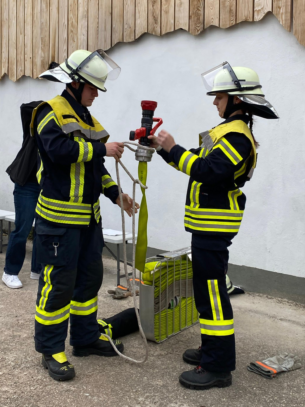 Vor der Übung herrschte auf dem Gelände des Feuerwehrhauses reges Treiben: Einsatzfahrzeug überprüfen, die letzten Knoten wiederholen, Abläufe nochmals durchsprechen und Organisatorisches erledigen. Unsere Teilnehmer trafen die letzten Vorbereitungen, bevor es mit der ersten Gruppe zur Abnahme der diesjährigen Leistungsprüfung „Die Gruppe im Löscheinsatz“ losging. Eine leichte Anspannung war dem einen oder anderen ins Gesicht geschrieben. Ein Feuerwehrkamerad legte sogar erst die erste Stufe der Leistungsprüfung ab.