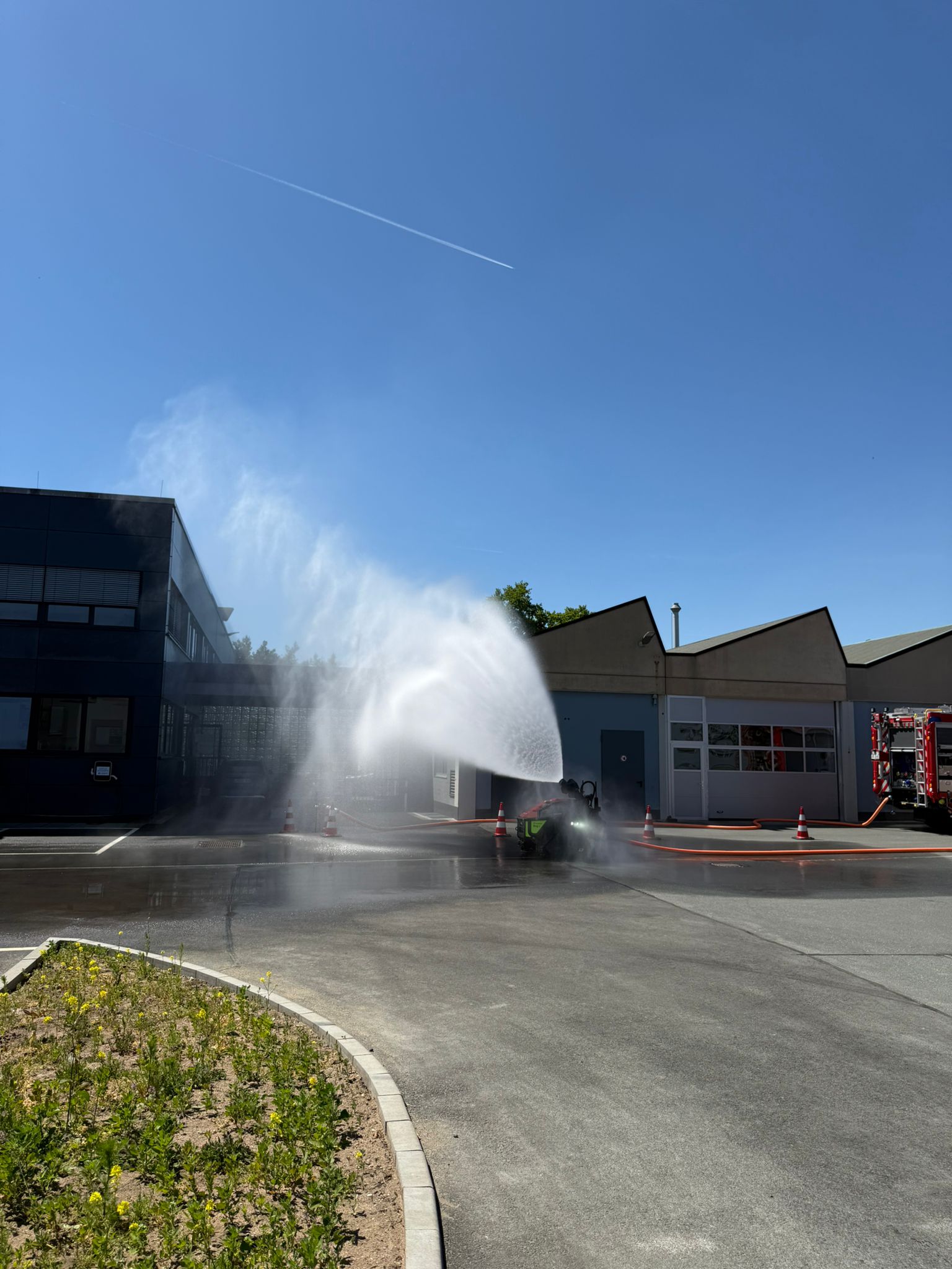 Von der enormen Leistungsfähigkeit des Löschroboters, der bis zu 2500 Liter Wasser pro Minute direkt oder mit Schaummittel versetzt als Löschschaum abgeben kann, konnten sich bei der Übergabe und der Vorführung durch Kommandant und Kreisbrandmeister Martin Knorr neben zahlreichen Gästen auch MdB Ralph Edelhäußer, Landrat Armin Kroder, der Röthenbacher Bürgermeister Klaus Hacker sowie Kreisbrandrat Holger Herrmann überzeugen.