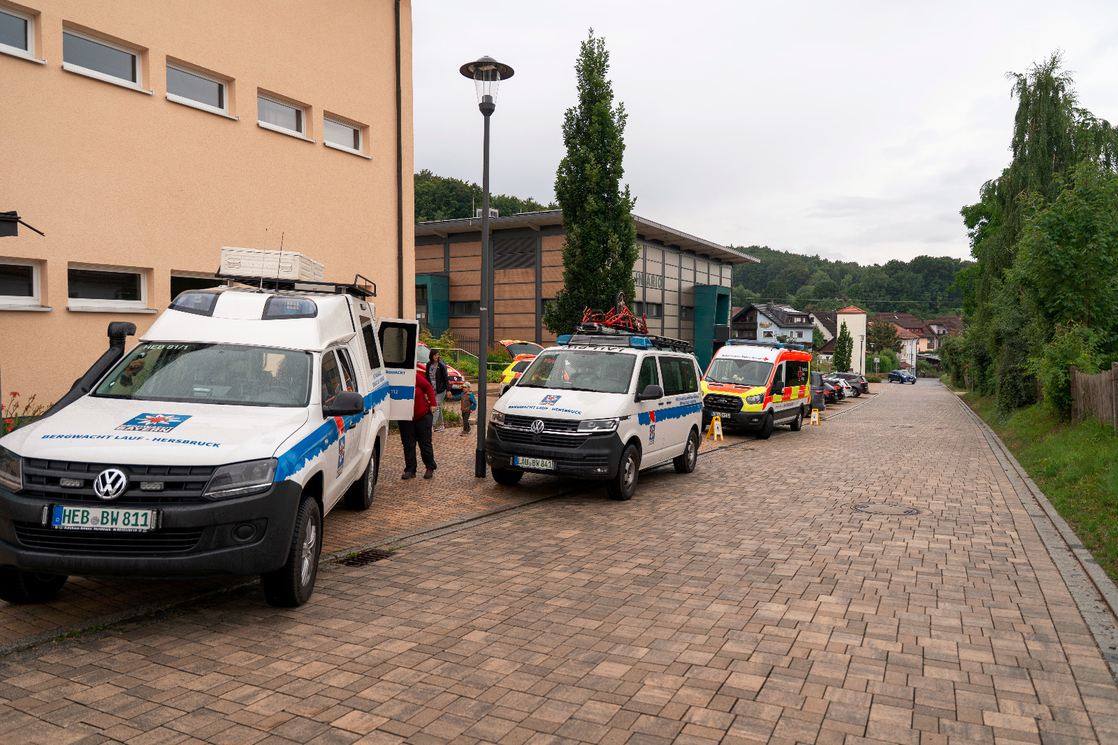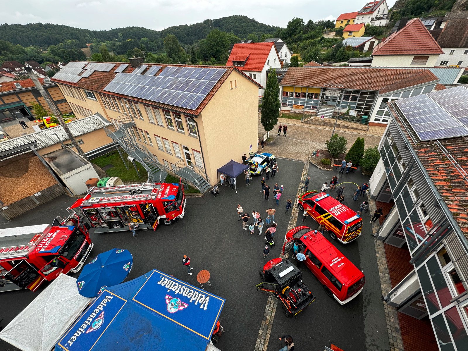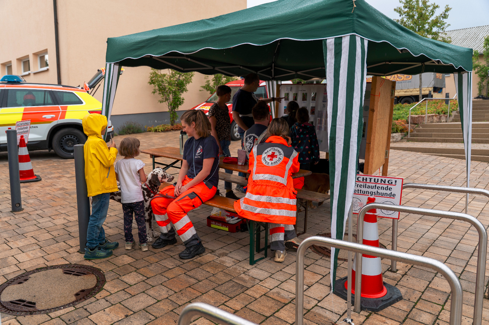 Am Nachmittag wurde ein abwechslungsreicher Familiennachmittag mit einem kreativen Kinderprogramm der Kinder- und Jugendfeuerwehr angeboten, welcher gut von der Bevölkerung trotz schlechten Wetters besucht wurde. Neben Gegrilltem, Kaffee und Kuchen, bildete die Blaulichtmeile das zentrale Highlight. Dort konnten Besucher eine Vielzahl an Einsatzfahrzeugen bestaunen – darunter Fahrzeuge der Gemeindefeuerwehren, ein Krankentransportwagen und eine Feldküche des ASB, die First Responder der FF Vorra, die Rettungshundestaffel des BRK, drei Fahrzeuge der Bergwacht Lauf / Hersbruck, sowie ein Streifenwagen der Polizei. An dieser Stelle noch der Dank an alle Teilnehmer der Blaulichtfamilie, die an diesem Nachmittag gekommen sind und dem Tag einen würdigen Rahmen gegeben haben.