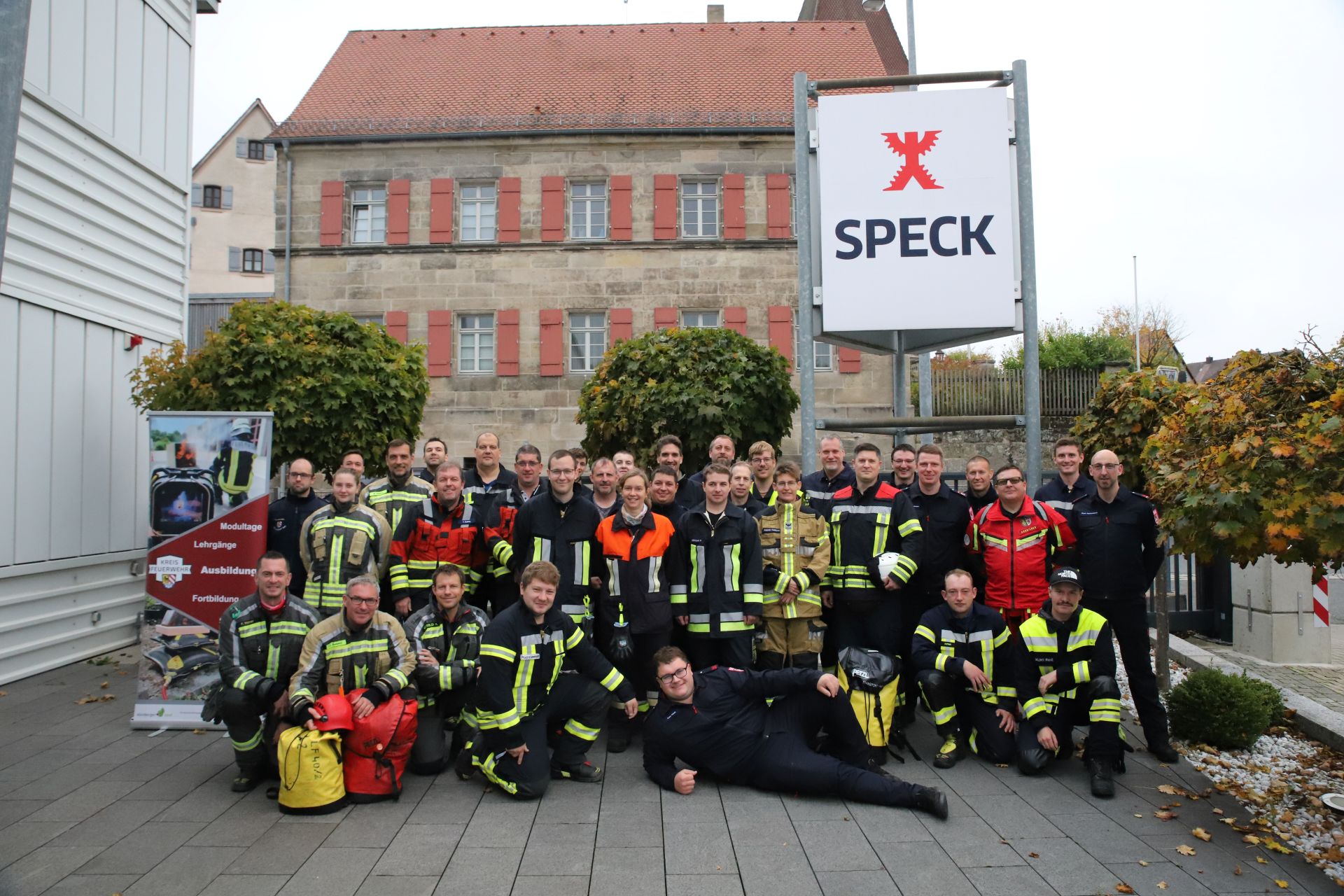 Die Kreisbrandinspektoren Oliver Heinecke und Philipp Wolshöfer sowie Kreisbrandmeister Frank Schmidt begrüßten die insgesamt 30 Teilnehmerinnen und Teilnehmer aus 14 Feuerwehren im gesamten Landkreis, die alle bereits die Ausbildung für die Absturzsicherung durchlaufen hatten. Sie dankten neben den Ausbildern auch den Verantwortlichen der Firma „Speck Pumpen“, die nicht nur das Übungsobjekt zur Verfügung stellten, sondern auch Kaltgetränke und Kaffee sponsorten.