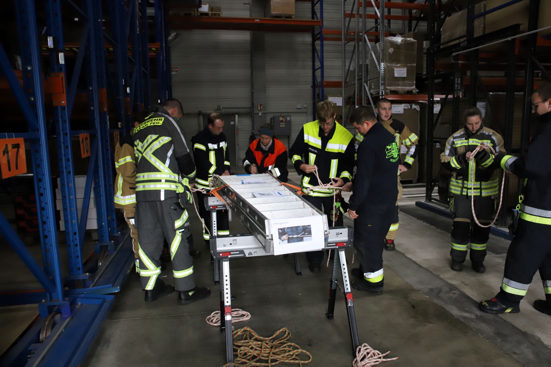 Die Rettung einer verunfallten Person mittels Schleifkorbtrage war Thema der dritten Station. Da es sich um den Modultag „Absturzsicherung“ handelte, erfolgte diese natürlich aus entsprechender Höhe und mit umfangreichen Sicherungsmaßnahmen. Hauptaugenmerk wurde hier neben der Sicherung auf das koordinierte Arbeiten innerhalb der Gruppe zur Rettung der Person gelegt, denn gerade in einem derartigen Einsatzszenario sind klare Absprachen entscheidend.