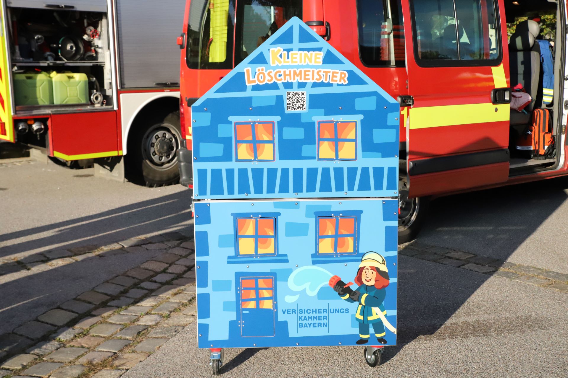 Die Gestaltung der Spritzwände orientiert sich am Feuerwehrspiel „Kleine Löschmeister“ der Versicherungskammer Bayern und ist grafisch entsprechend gestaltet. Zur gespendeten Ausstattung gehört neben der eigentlichen Spritzwand, die gut transportabel auf einem Rollwagen montiert ist, auch das nötige Zubehör. Die Spritzwand selbst ist, um entsprechend langlebig zu sein, hochwertig und aus Metall gefertigt.