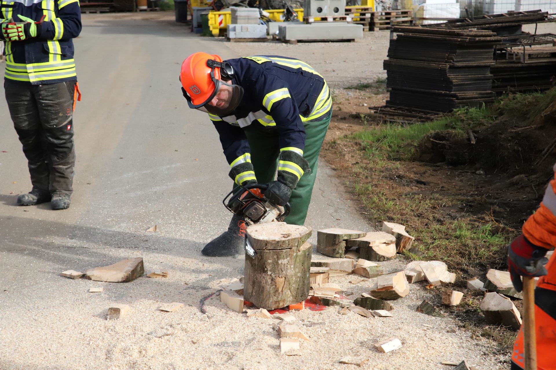 Im Anschluss ging es dann zur Praxis. Neben dem Arbeiten mit Hölzern unter Spannung am Spannungssimulator wurden gemeinsam mit den erfahrenen Ausbildern auch Schnitt- und Fälltechniken an insgesamt drei Ausbildungsstationen geübt. Dabei wurde wert auf möglichst praxisnahe Szenarien gelegt.