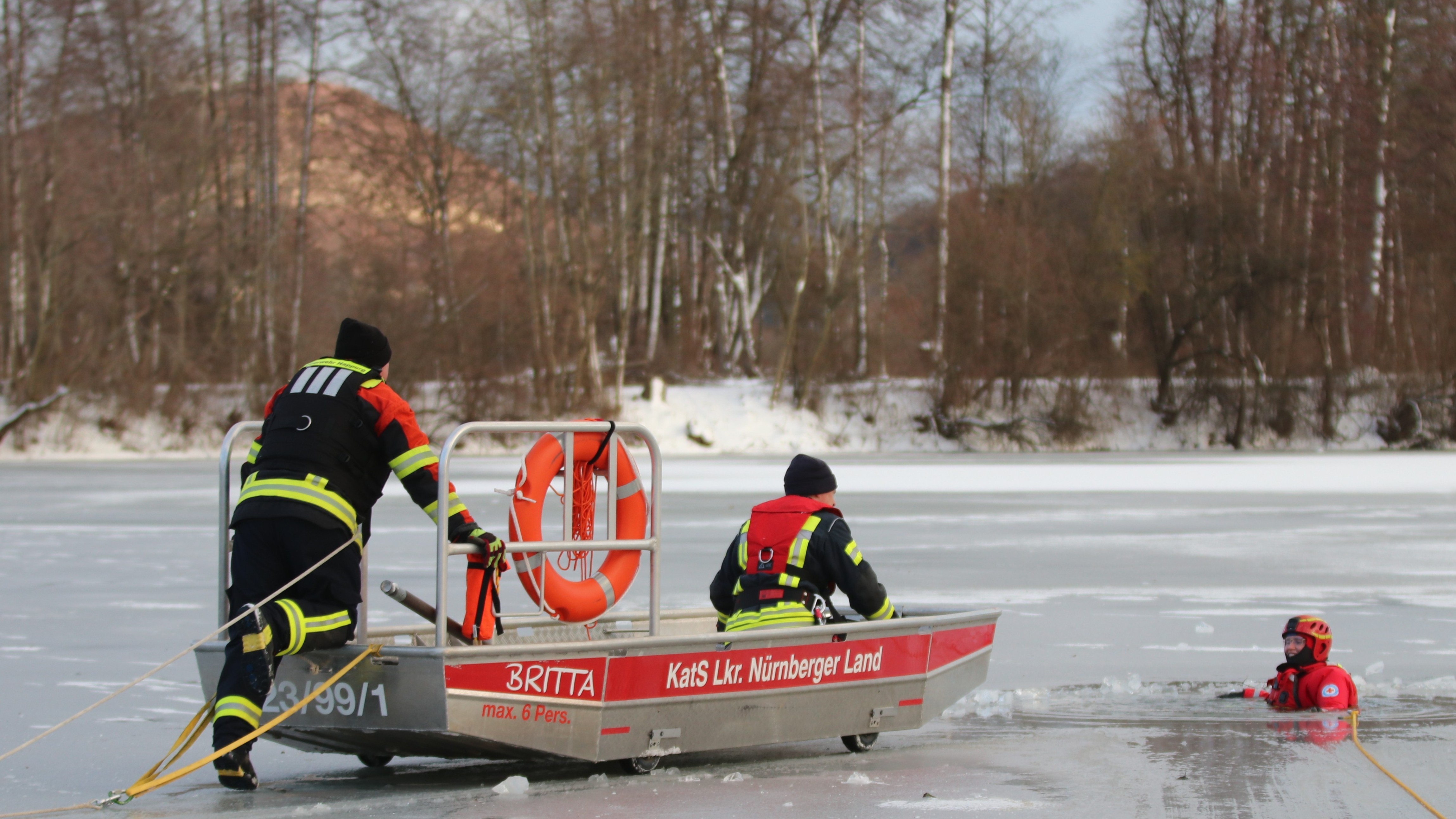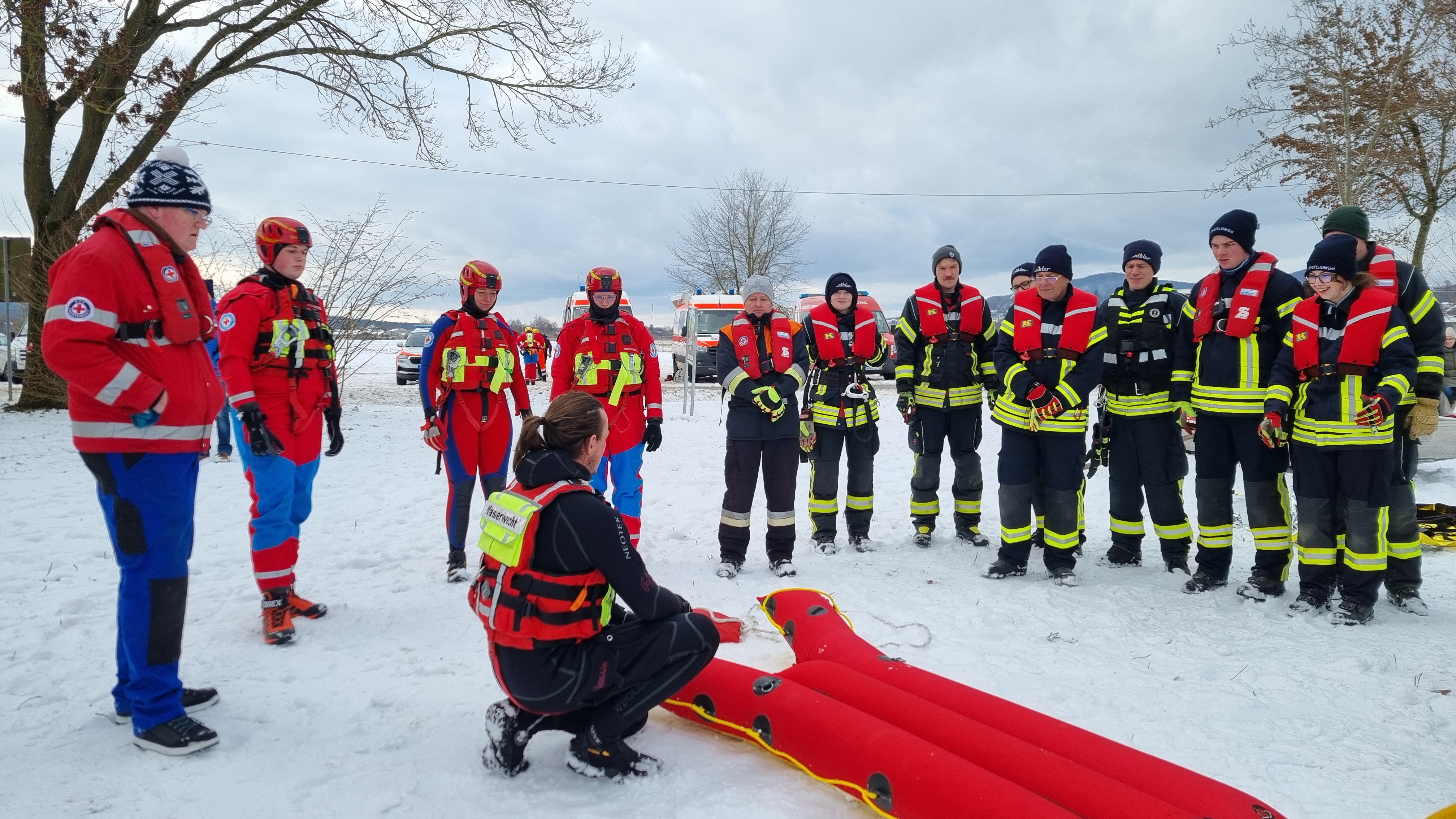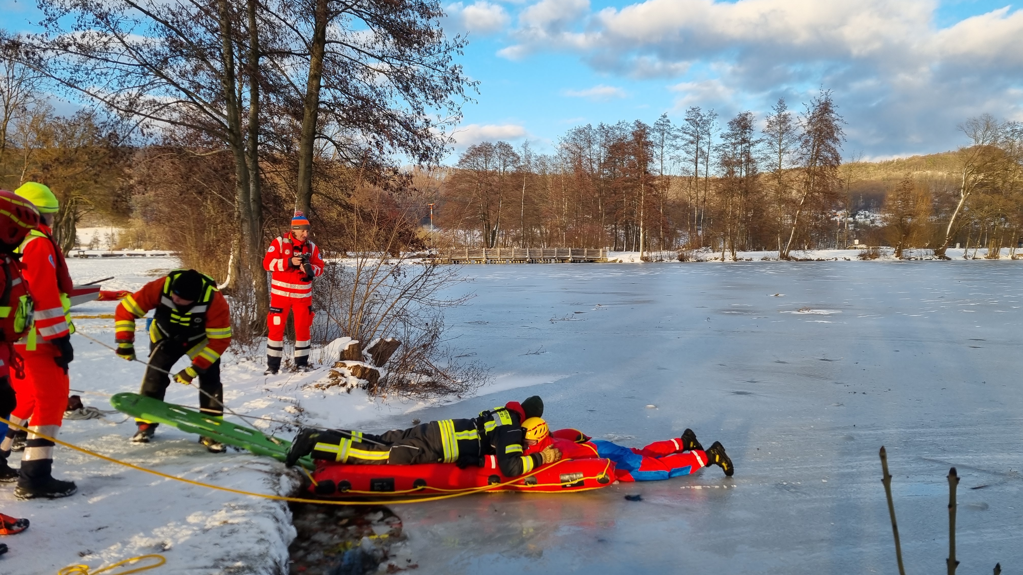 Happurg (DB 1) - Mit einer eindrucksvollen Eisrettungsübung haben Wasserwacht und Feuerwehr am Wochenende ihre Einsatzbereitschaft für Notfälle auf zugefrorenen Gewässern unter Beweis gestellt. Bei Temperaturen knapp unter dem Gefrierpunkt probten die Einsatzkräfte am Happurger Baggersee verschiedene Rettungsszenarien. Auch viele interessiert Zuschauer waren anwesend und beobachteten das Übungsgeschehen.