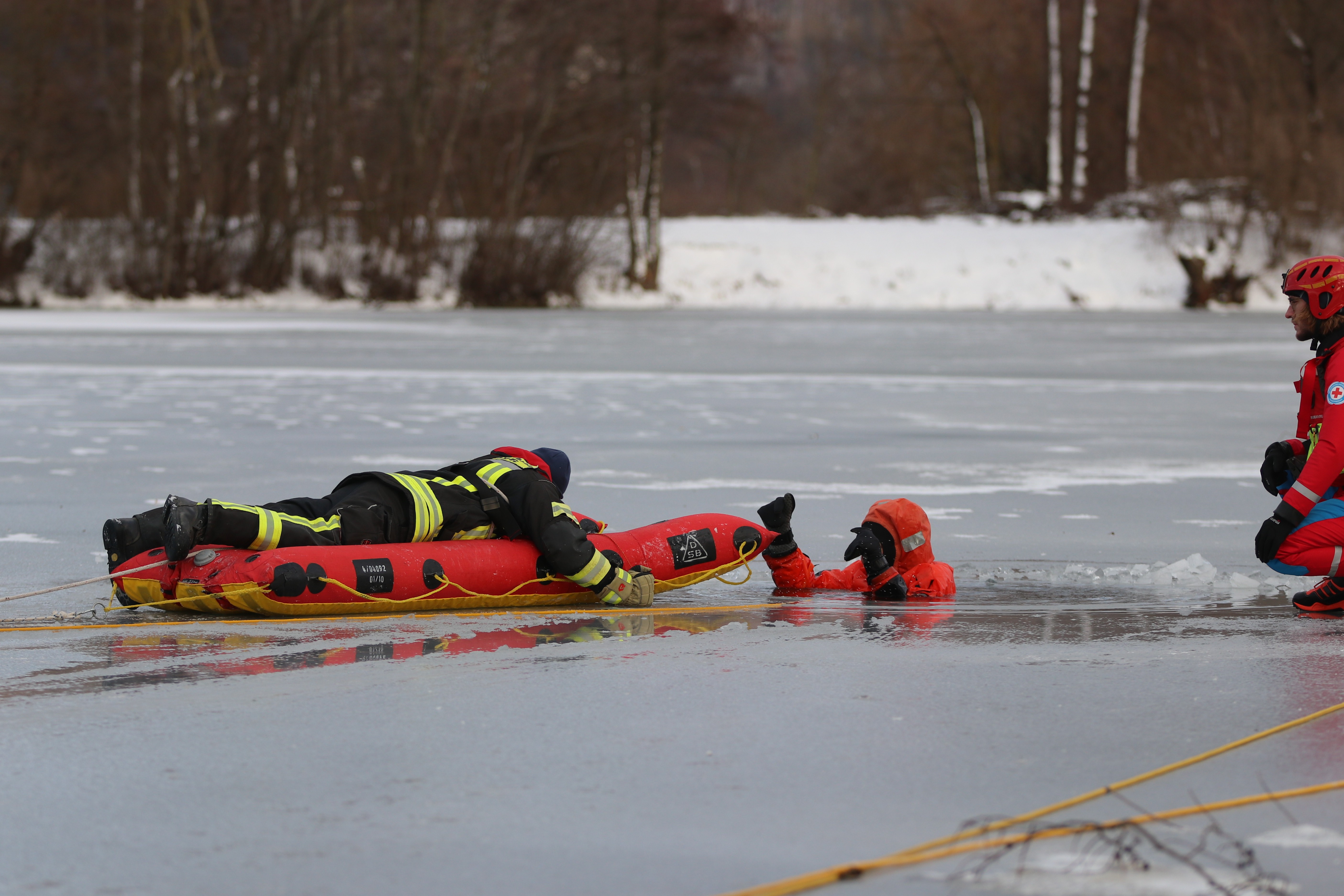 Bereits in der Vergangenheit übten die beiden Rettungsorganisationen zusammen. Der Einsatzleiter der Wasserwacht, Patrick Lebrecht und der Einsatzleiter der Feuerwehr, Thomas Loos betonten bei Ihrer Einweisung, wie wichtig gemeinsame Übungen für den späteren Einsatzerfolg sind. So stand auch im Mittelpunkt vor allem das Zusammenspiel beider Organisationen. Gemeinsam trainierten die Teams die Annäherung an eine ins Eis eingebrochene Person sowie die Rettung aus der Einbruchstelle.