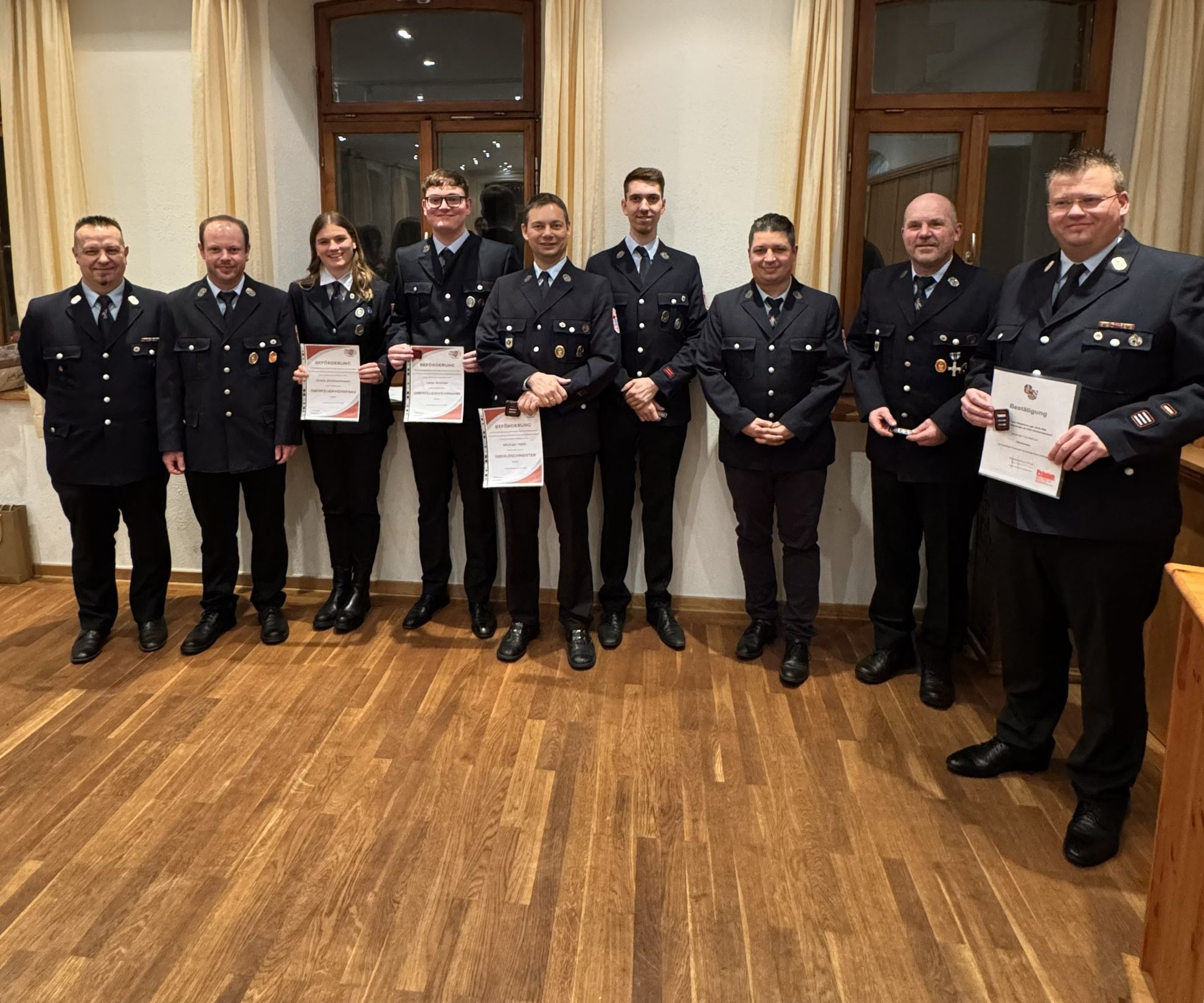 Ehrungen für den langjährigen aktiven Dienst erhielten Philipp Decker, Markus Vogel und Stefan Vogel für 10 Jahre, Tobias Waitz für 20 Jahre sowie Bernd Bleisteiner, Bernd Fuchs und Martin Zeltner für 25 Jahre.