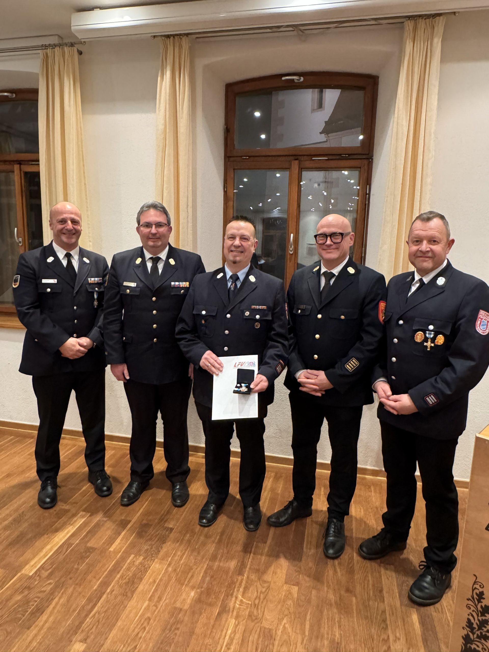 Dieser Wechsel konnte jedoch nicht vonstattengehen, ohne Michael Raum für sein langjähriges Engagement und seinen Einsatz zu Ehren. Von der Kreisbrandinspektion wurde Raum mit dem bayerischen Ehrenkreuz in Silber vom Landesfeuerwehrverband Bayern ausgezeichnet. KBR Holger Herrmann, KBI Thorsten Brunner sowie KBM Kay Marienfeld und Bürgermeister Klaus Albrecht ließen es sich nicht nehmen, Raum diese Würdigung nach ein paar Worten persönlich zu überreichen.