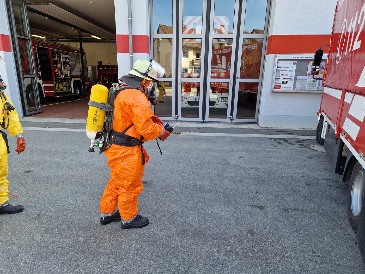 Im Rahmen von zwei Szenarien übten die Teilnehmer anschließend das einsatzmäßige Arbeiten mit den Anzügen und den Durchgang durch die Dekonstation. Neben dem Festlegen der Absperrgrenze und des Gefahrenbereichs sowie dem Durchführen von Messungen mussten auch betroffene Personen gerettet, dekontaminiert sowie ein verunfallter Feuerwehrmann notfallmäßig aus dem Anzug geholt werden.