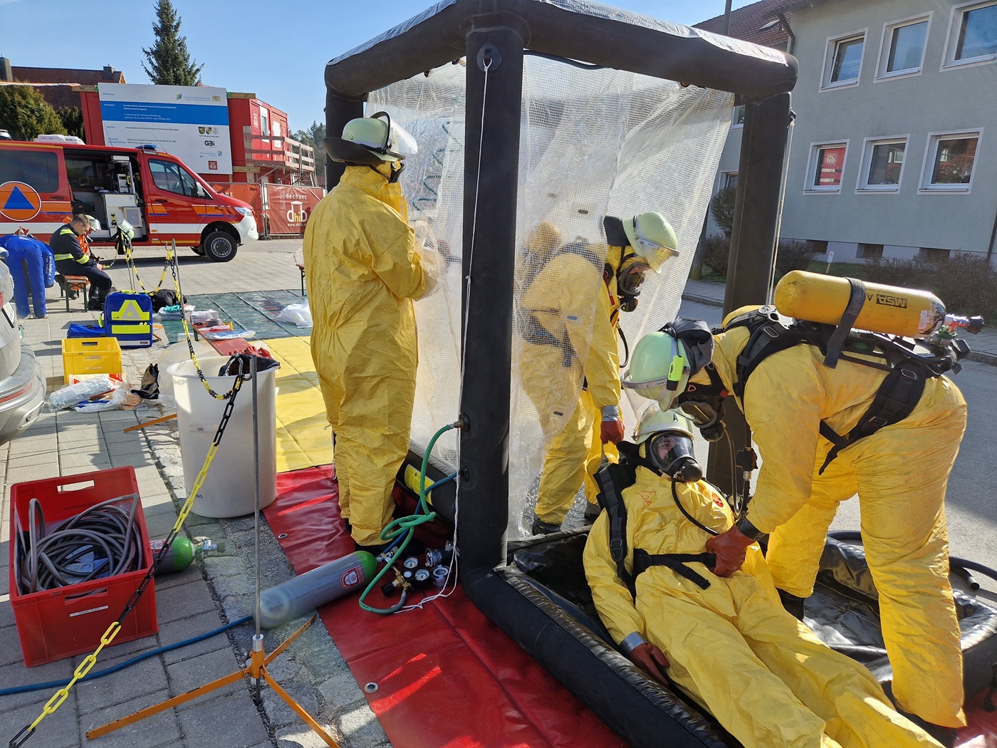 Ein Schwerpunkt der Ausbildung war der Umgang mit der Dekontaminationsstation, in der kontaminierte Feuerwehrleute nach dem Einsatz fachgerecht gereinigt und entkleidet werden können. Dabei ist besonders zu beachten, dass keine Verschleppung von Gefahrstoffen auftritt.
