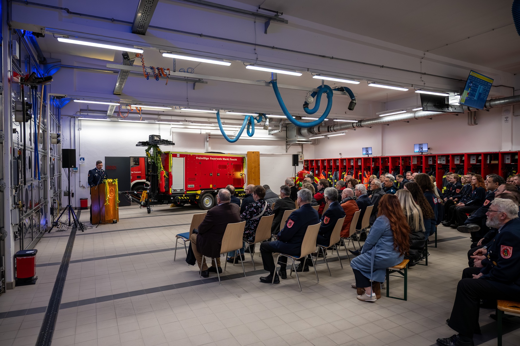 Felsner freute sich, als Kommandant gleich zwei neue Fahrzeuge in Dienst stellen zu können. Der Stromanhänger eröffnet die Sicherheit, in Zeiten von Strommangellagen und Störungen in Stromnetzen im Feuerwehrhaus, das im Katastrophenfall auch als sog. Einsatzleuchtturm und Führungsstelle betrieben wird, unabhängig voll handlungsfähig zu bleiben. Auch die angebaute Rettungswache kann mitversorgt werden. Die Drehleiter als das herausragende Fahrzeug im Feuchter Fuhrpark, von seiner Ausstattung und Leistungsfähigkeit und der verbauten Technik aktuell eines der modernsten Hubrettungsfahrzeuge für seine Hauptaufgabe: der Rettung von Menschenleben.