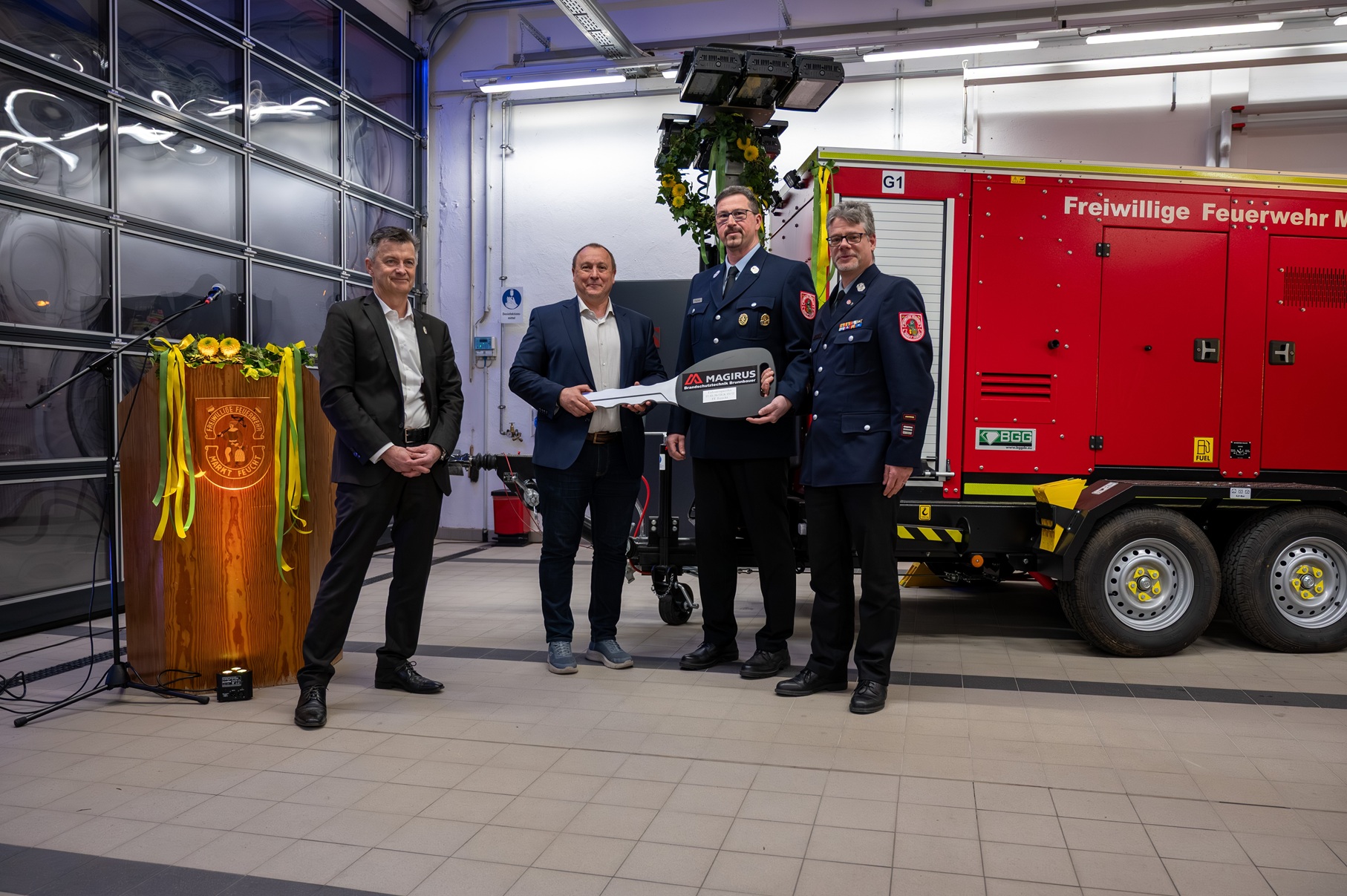 Otmar Fassold als Vertreter der Drehleiter-Herstellerfirma Magirus übergab offiziell den Fahrzeugschlüssel an den Bürgermeister und wünschte allzeit gute Fahrt und gute Heimkehr von allen Einsätzen. Bürgermeister Kotzur als Dienstherr der Feuerwehr reichte den Schlüssel weiter an Kommandant Felsner und lud damit alle Anwesenden zum Abschluß des Abends zu einem gemeinsamen Imbiss ein.