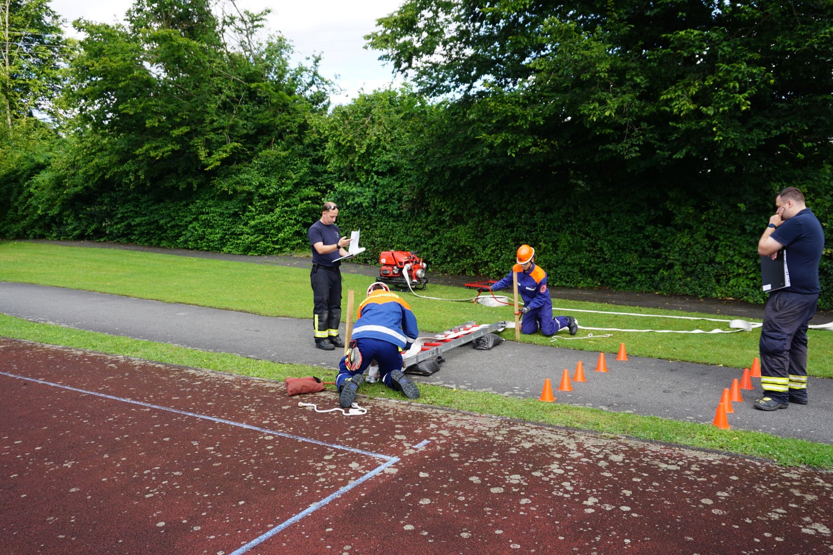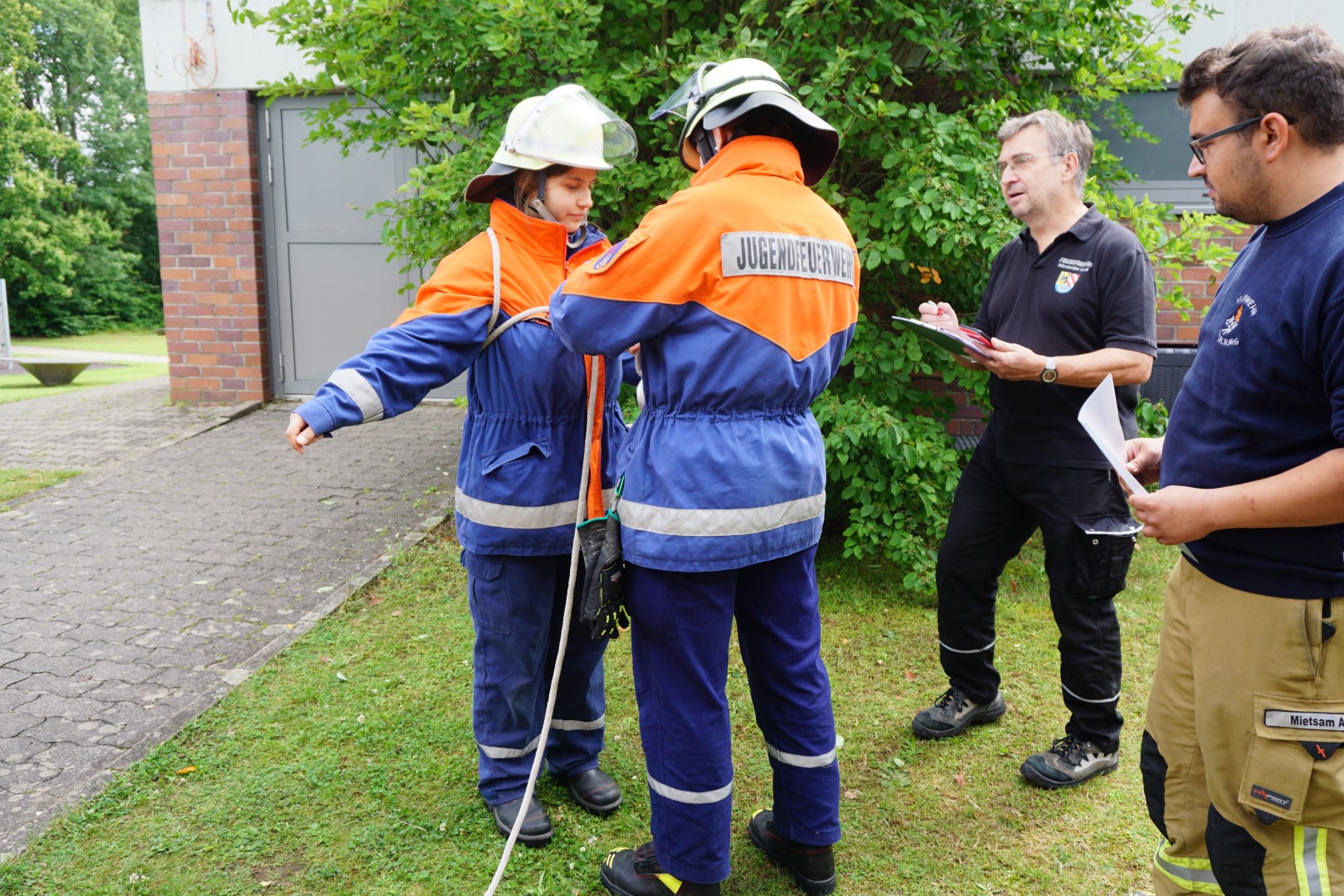 Ihre Aufgaben absolvierten die Jugendlichen, die sich mit ihren Jugendwartinnen und Jugendwarten wieder bestens vorbereitet hatten, wie gewohnt mit Bravour. Dabei mussten sie bei der Stufe 3 wieder einiges an feuerwehrtechnischem Wissen und Können unter Beweis stellen. Bei den Knoten und Stichen stand in dieser Prüfung der Brustbund mit Spierenstich, auch bekannt als „Rettungsknoten“, und damit die Königsklasse der Knoten auf dem Plan. Auch im Bereich der Ersten Hilfe mussten die Teilnehmerinnen und Teilnehmer ihr Wissen unter Beweis stellen und wichtige Grundkenntnisse, wie die Feststellung von Vitalzeichen und die stabile Seitenlage, beherrschen.