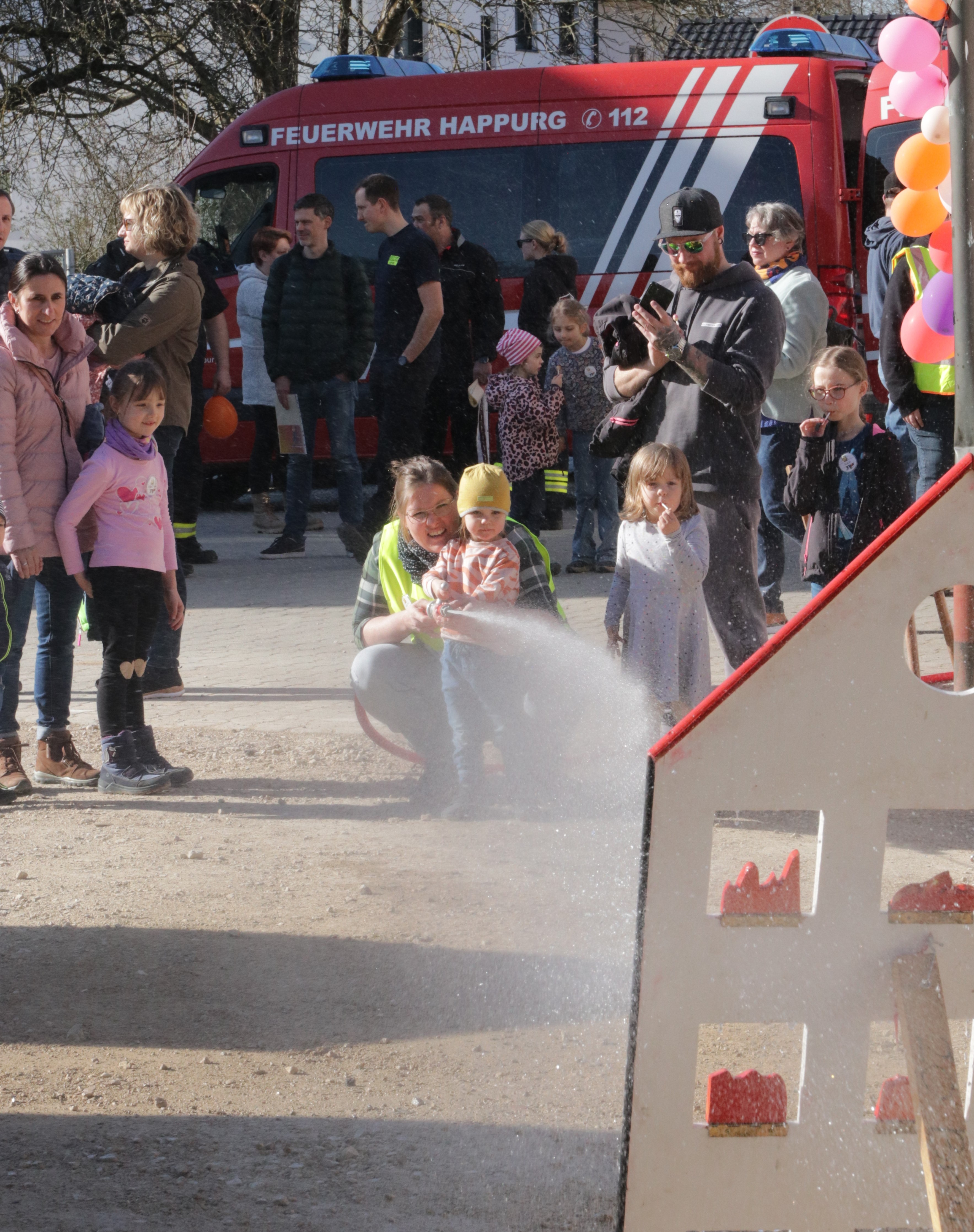 Davor wurde schon von den Betreuerinnen und einigen Feuerwehrkameraden vieles vorbereitet. So wurde zum Beispiel ein ,,Atemschutz-Parkour" errichtet, bei dem die Kinder in einem abgedunkelten Pavillon, der einer nachgebauten Wohnung ähnelte, das Maskottchen, den Feuerwehr-Salamander, retten mussten. Nach der erfolgreichen Rettung bekamen sie eine personalisierte Medaille überreicht.