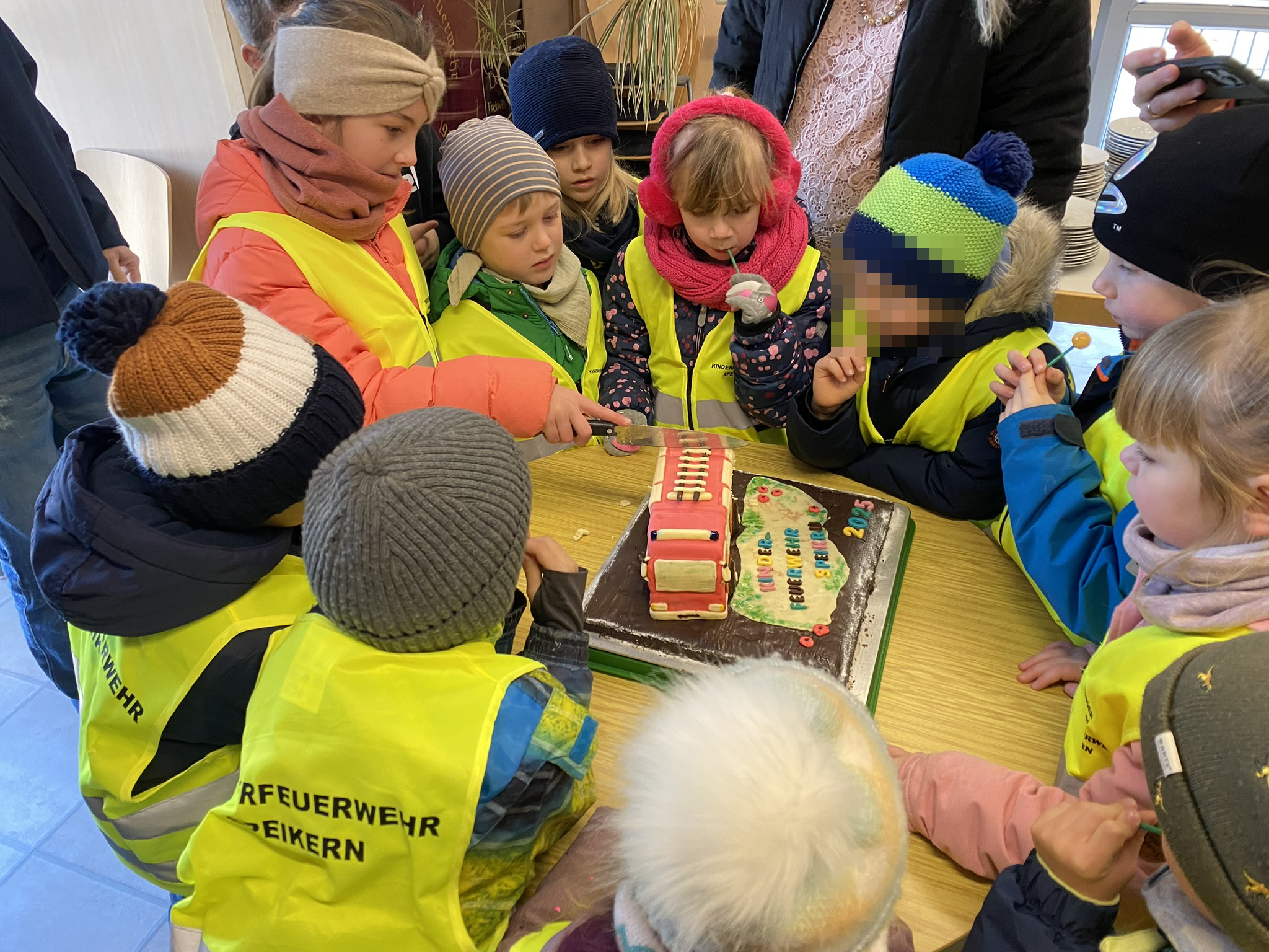 Ein besonderes Highlight der Veranstaltung war der Auftritt der Kinder, die gemeinsam ein fröhliches Feuerwehrlied vortrugen. Danach durften Sie einen kunstvoll gestalteten Feuerwehrkuchen anschneiden. Nach dem offiziellen Teil ließ man die Feierstunde in gemütlicher Runde ausklingen. Bei leckeren Häppchen, erfrischenden Getränken sowie Kaffee und selbstgebackenem Kuchen nutzten die Gäste die Gelegenheit, sich auszutauschen und die gelungene Gründung der Kinderfeuerwehr zu feiern. Für die Kinder war ein Parkour mit Spielen aus dem Spieleanhänger der Jugendfeuerwehr Nürnberger Land aufgebaut.