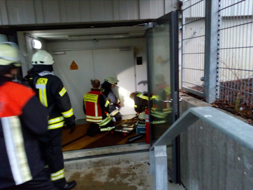 Da die HEWA sich bereits auf der Anfahrt befand hat man von einer gewaltsamen Öffnung abgesehen und ging mit zwei Trupps unter Atemschutz auf Bereitstellung.