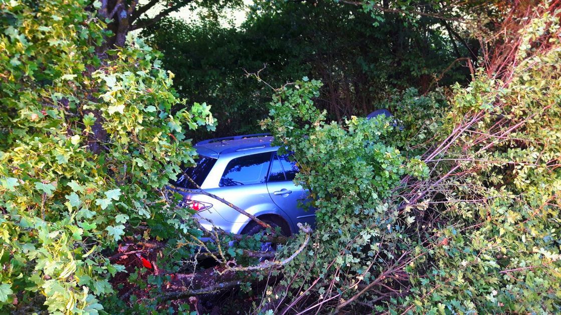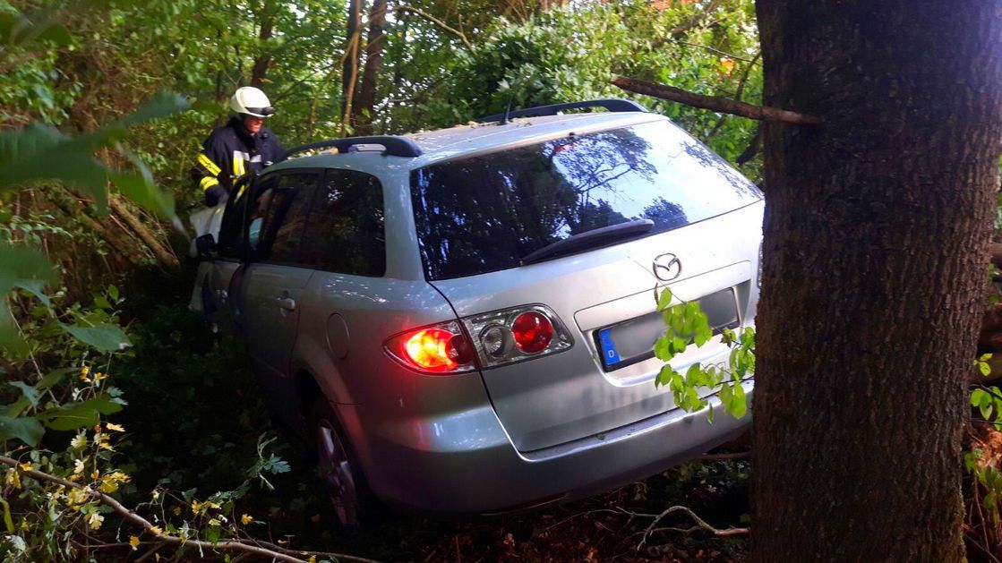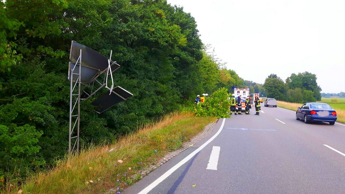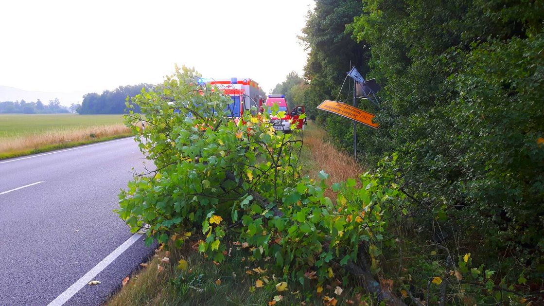 Ein PKW kam aus ungeklärter Ursache alleine beteiligt von der Fahrbahn ab, stieß gegen einen Vorwegweiser und fällte im weiteren Verlauf noch zwei Bäume, bis er in Graben zum stehen kam.