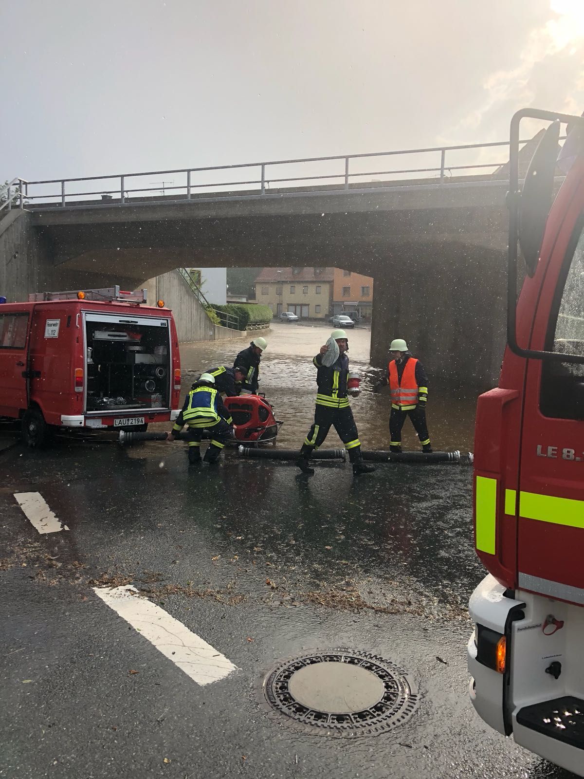 Neuhaus/Pegnitz (DB 1) - Am 04.08.2018 traf den Markt Neuhaus a.d. Pegnitz eine Starkregenzelle, das Unwetter dauerte ca. 20 min. In dieser Zeit regnete es im Ortskern von Neuhaus 45 Liter auf den Quadratmeter, die Kanalisation konnte diese Regenmenge nicht mehr aufnehmen und es kam zu massiven Überschwemmung von Grundtücken, Bahnunterführungen und Strassen im Gemeindegebiet.