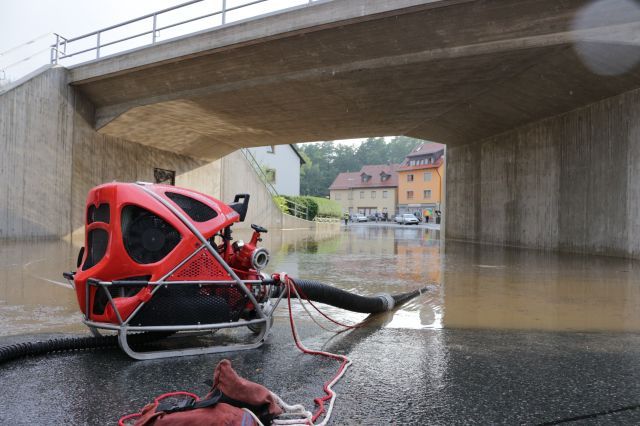 Die Neuhauser und Krottenseer Einsatzkräfte pumpten das Wasser mit einer PFPN 10-1000 aus der Unterführung, danach säuberten sie die Kanaleinläufe und die Strasse.