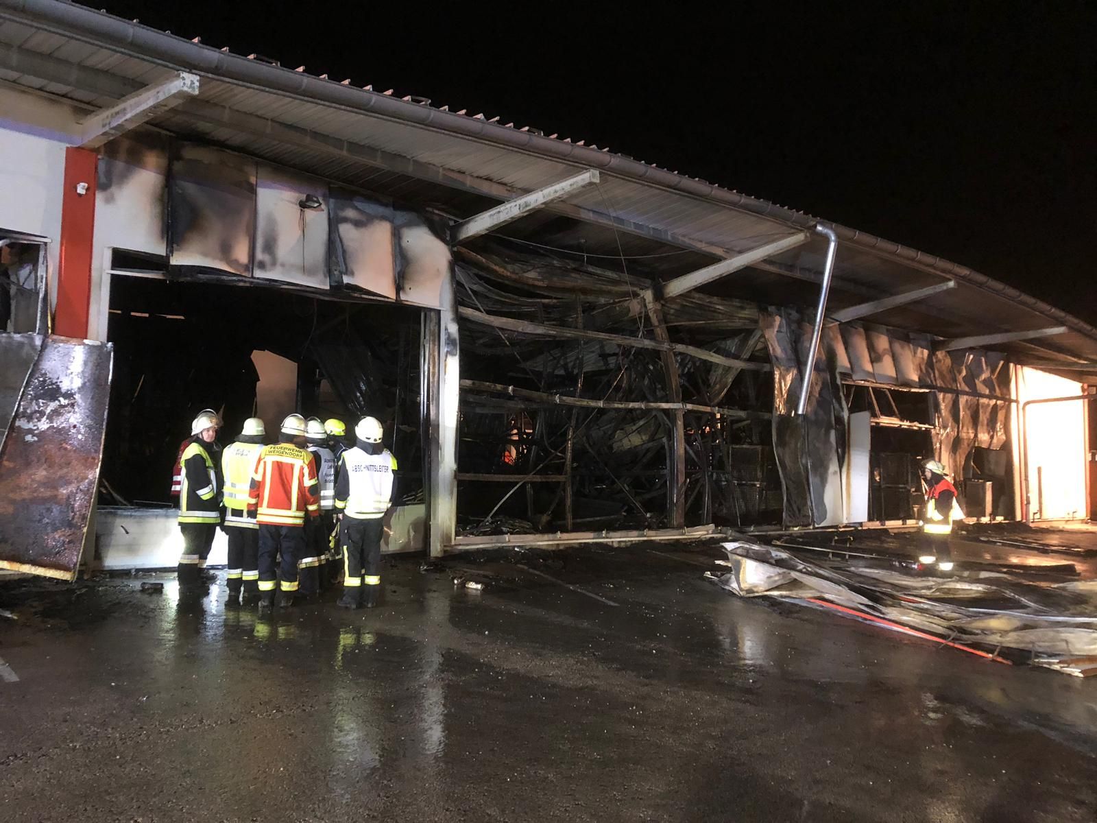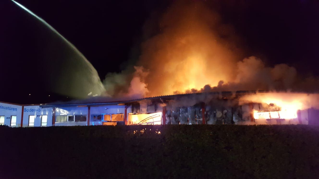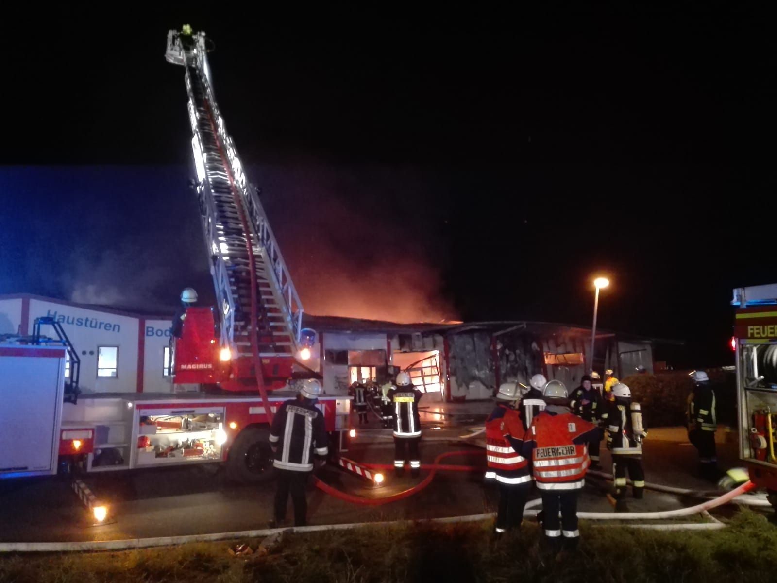 Weigendorf (Lkr. Amberg-Sulzbach) - Am Donnerstag den 29. November 2018 brach in einer Montage- und Lagerhalle eines Fenster- und Türenhändlers ein Feuer aus. Eine Explosion schreckte Anwohner und Angestellte des Unternehmens auf. Innerhalb weniger Minuten stand die gesamte Halle in Vollbrand. Das Bürogebäude und die Ausstellungsräume konnten von den Flammen gerettet werden, die Löscharbeiten in der Halle gestalteten sich aufwändig. Ein Landkreis übergreifender Großeinsatz für über 200 Einsatzkräfte. Es entstand ein Schaden von zirka 2 Millionen Euro.