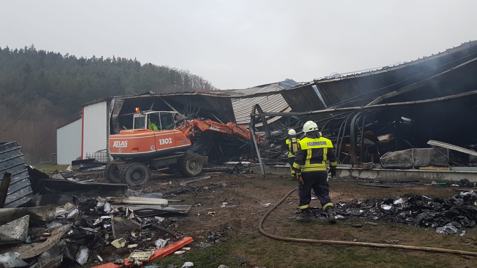 Am Sonntagmorgen loderten ein letztes Mal Flammen in den Resten der Halle auf. Um 08.53 Uhr alarmierte die ILS Amberg nochmals die Feuerwehr Weigendorf zu letzten Nachlöscharbeiten. Unter Atemschutz wurden die letzten Glutnester mit Schaum abgedeckt.