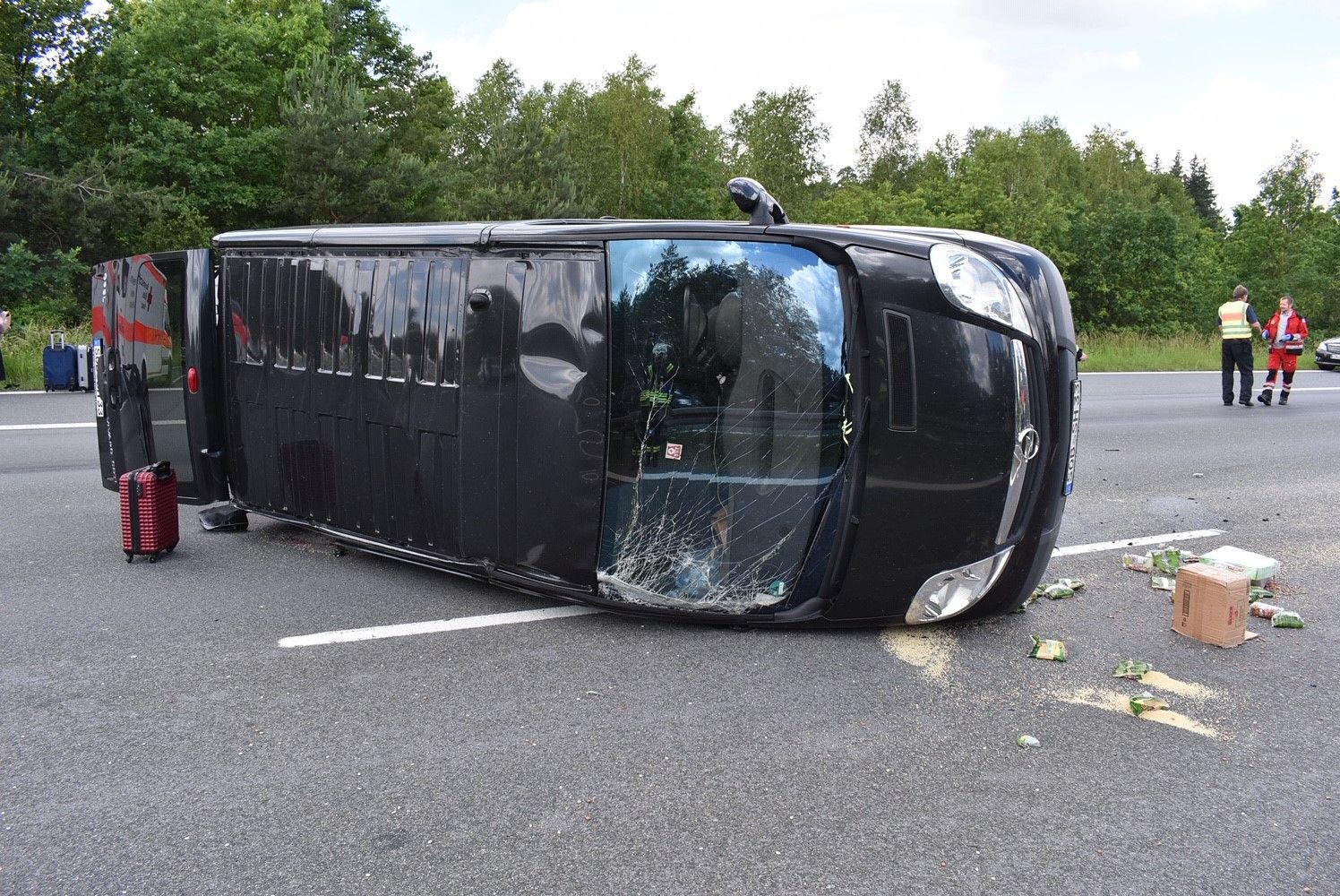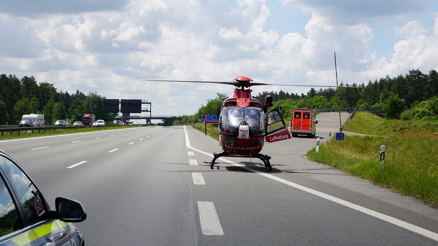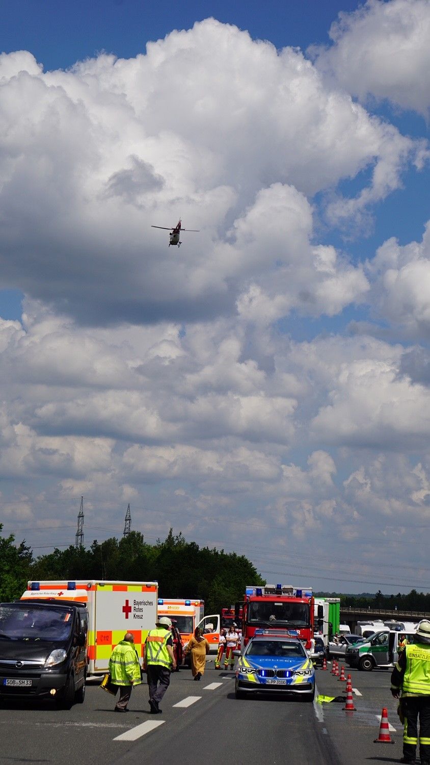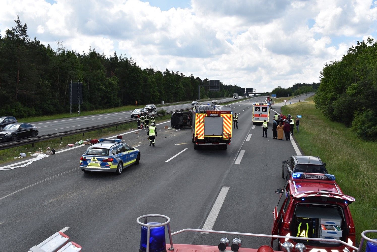 Ein allein beteiligter Opel Kleinbus verlor aus ungeklärter Ursache auf der linken Fahrspur die Kontrolle und bei den Gegenlenkmaßnahmen schaukelte das Fahrzeug derart auf, dass es sich einmal überschlug und zwischen der linken und mittleren Fahrspur auf der rechten Fahrzeugseite zum Liegen kam. Aufgrund der 9 Personen, welche sich zum Zeitpunkt des Unfalls im Kleinbus befanden, wurde ein Großaufgebot an Rettungskräften inklusive der Sanitätseinsatzleitung an die Einsatzstelle alarmiert. Bei Eintreffen der Floriansjünger waren bereits alle Personen aus dem Kleinbus heraus und wurden durch den Rettungsdienst im Bereich des Standstreifens versorgt. Für die Landung des Rettungshubschraubers hatte die Verkehrspolizeiinspektion Feucht bereits eine Vollsperre der A9 Richtung München veranlasst. Die Feuchter Feuerwehr übernahm die Vollsperre und sicherte die Einsatzstelle ab, band auslaufende Betriebsmittel und stellte den Brandschutz sicher.