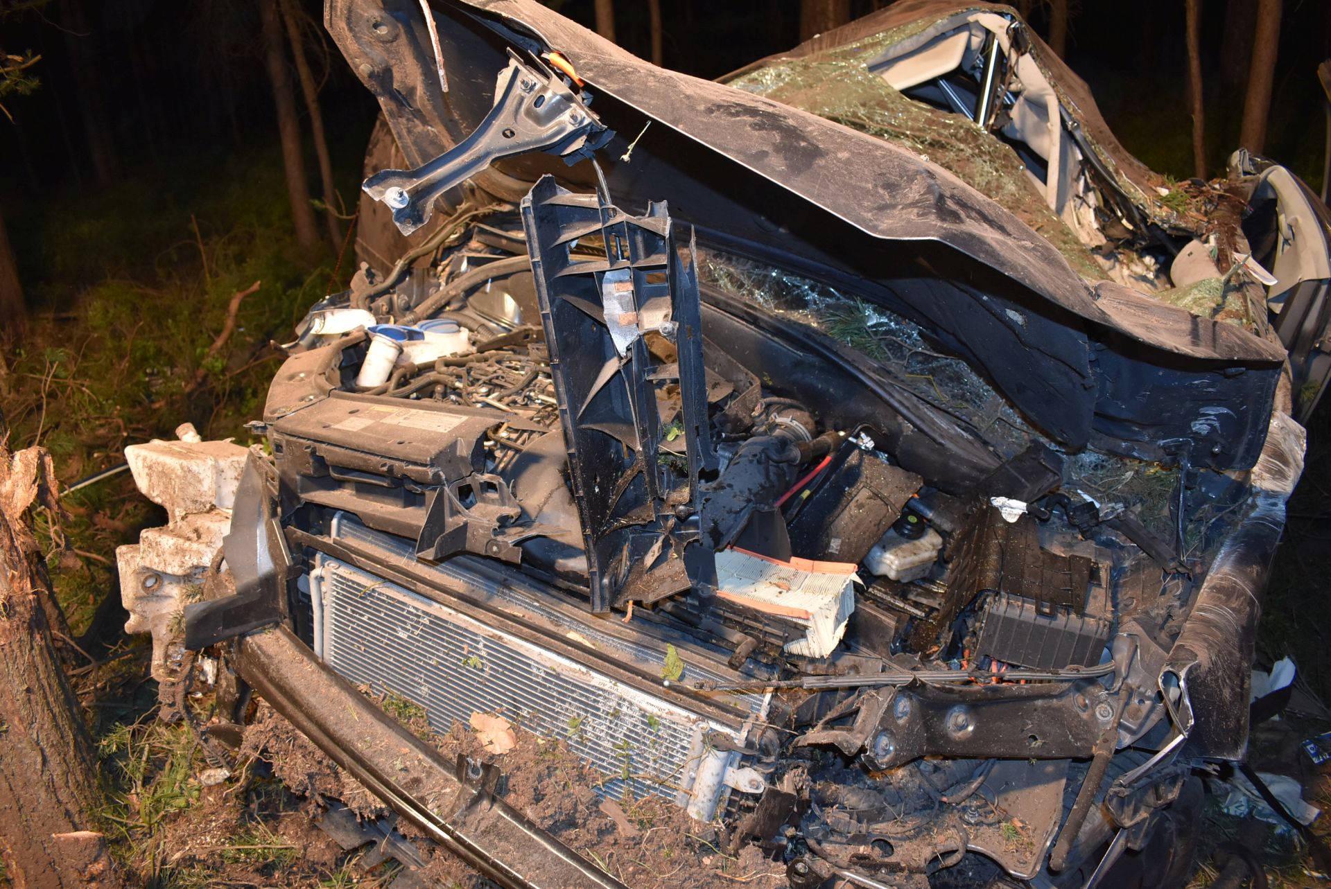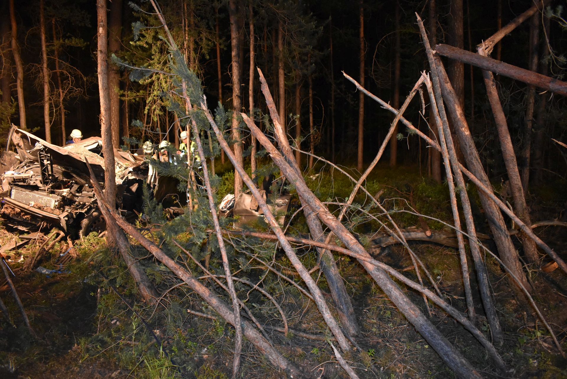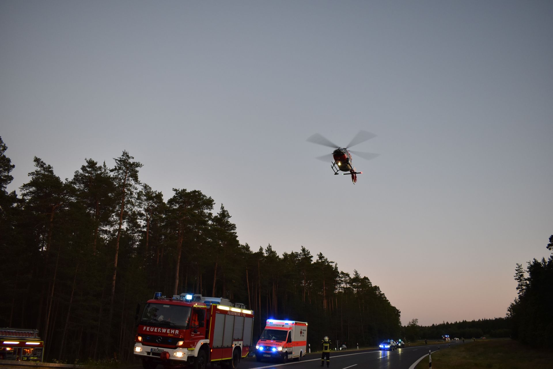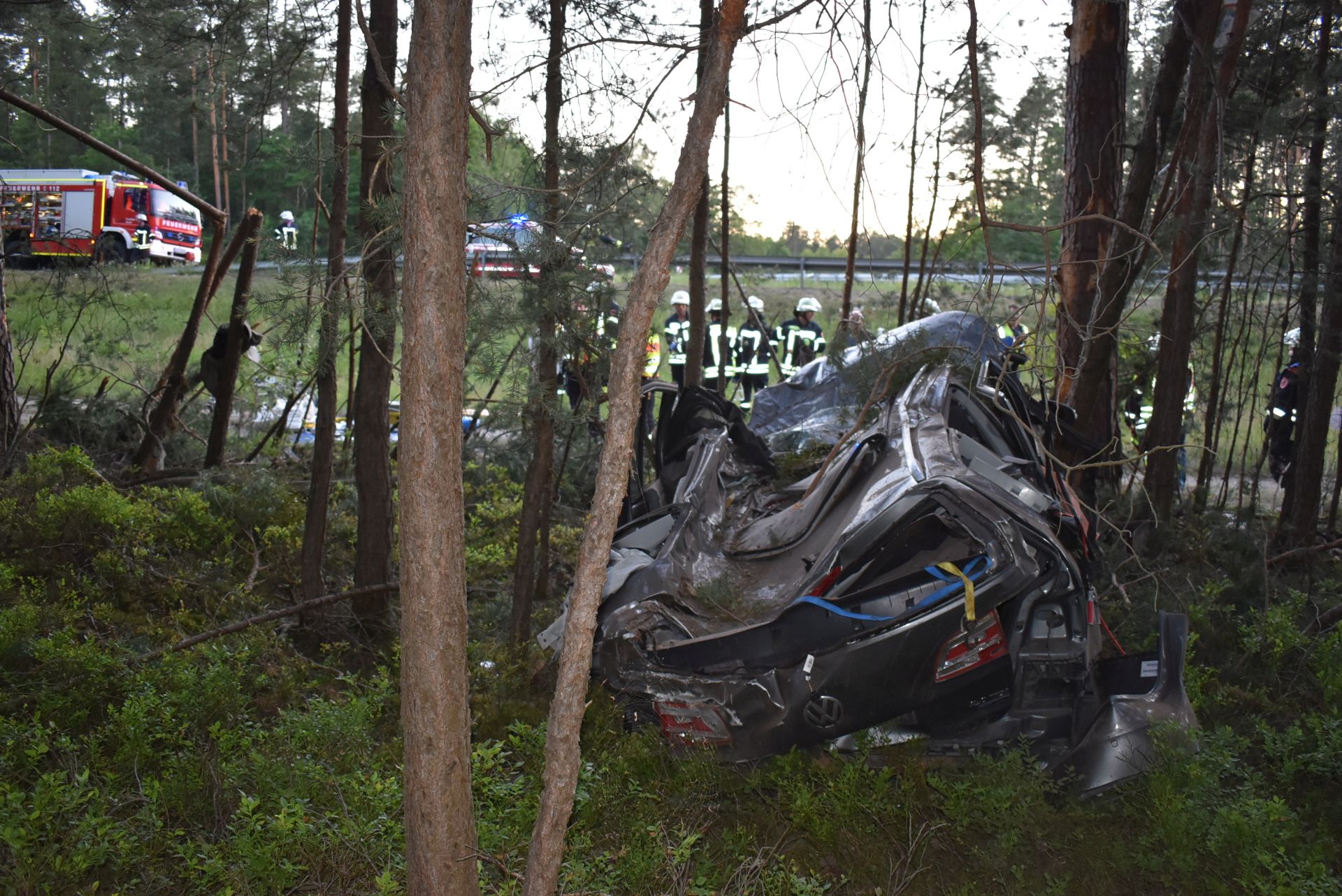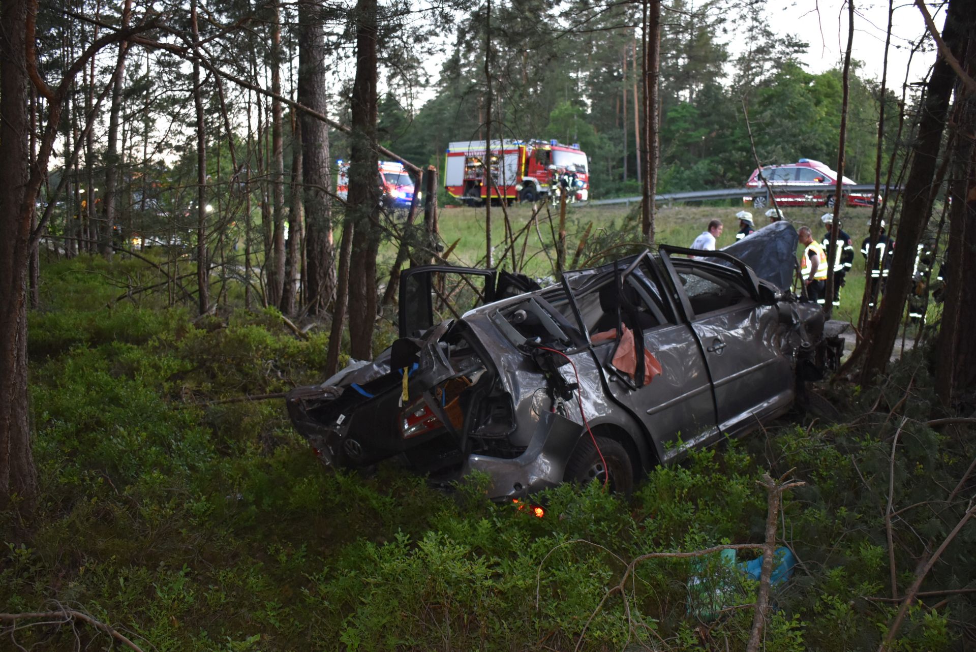 Am Überleiter der A9 zur A73 in Richtung Nürnberg war ein VW Crosstouran aus noch unbekannter Ursache in einer S-Kurve von der Fahrbahn abgekommen und in ein Waldstück geraten. Dabei stellte sich das Fahrzeug auf und stieß mit dem Dach voran gegen einen Baum. Beim Aufprall wurde der VW komplett zerstört, die Trümmerteile in einem weiten Radius verstreut. Bei Eintreffen der Rettungskräfte war der Fahrer bereits tot und aufgrund der Deformierung unter dem Dach eingeklemmt. Durch den Einsatz eines Rettungshubschraubers war die Autobahn komplett gesperrt. In Absprache mit der Polizei wurde diese Sperrung bis zum Ende aller Arbeiten aufrecht erhalten.