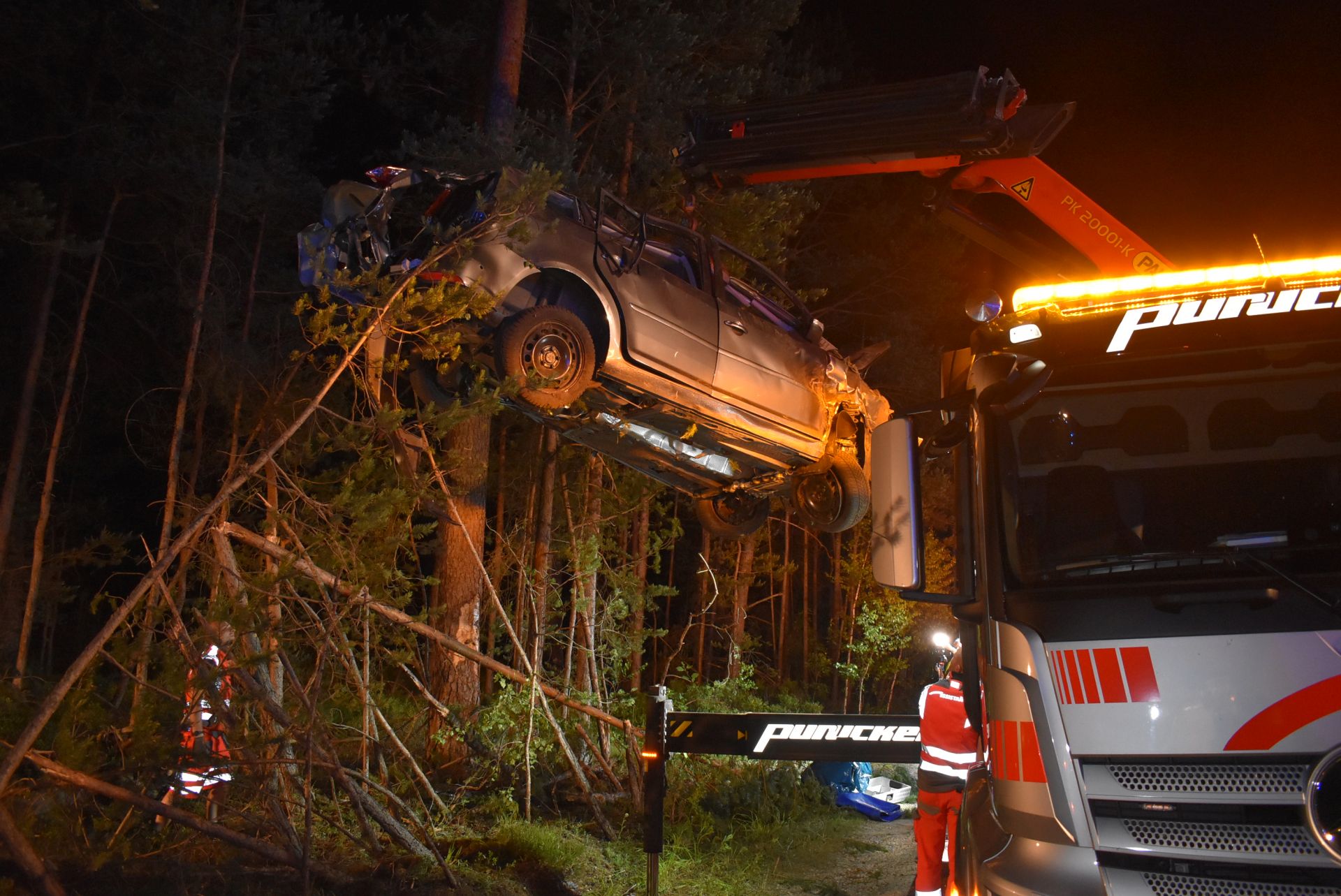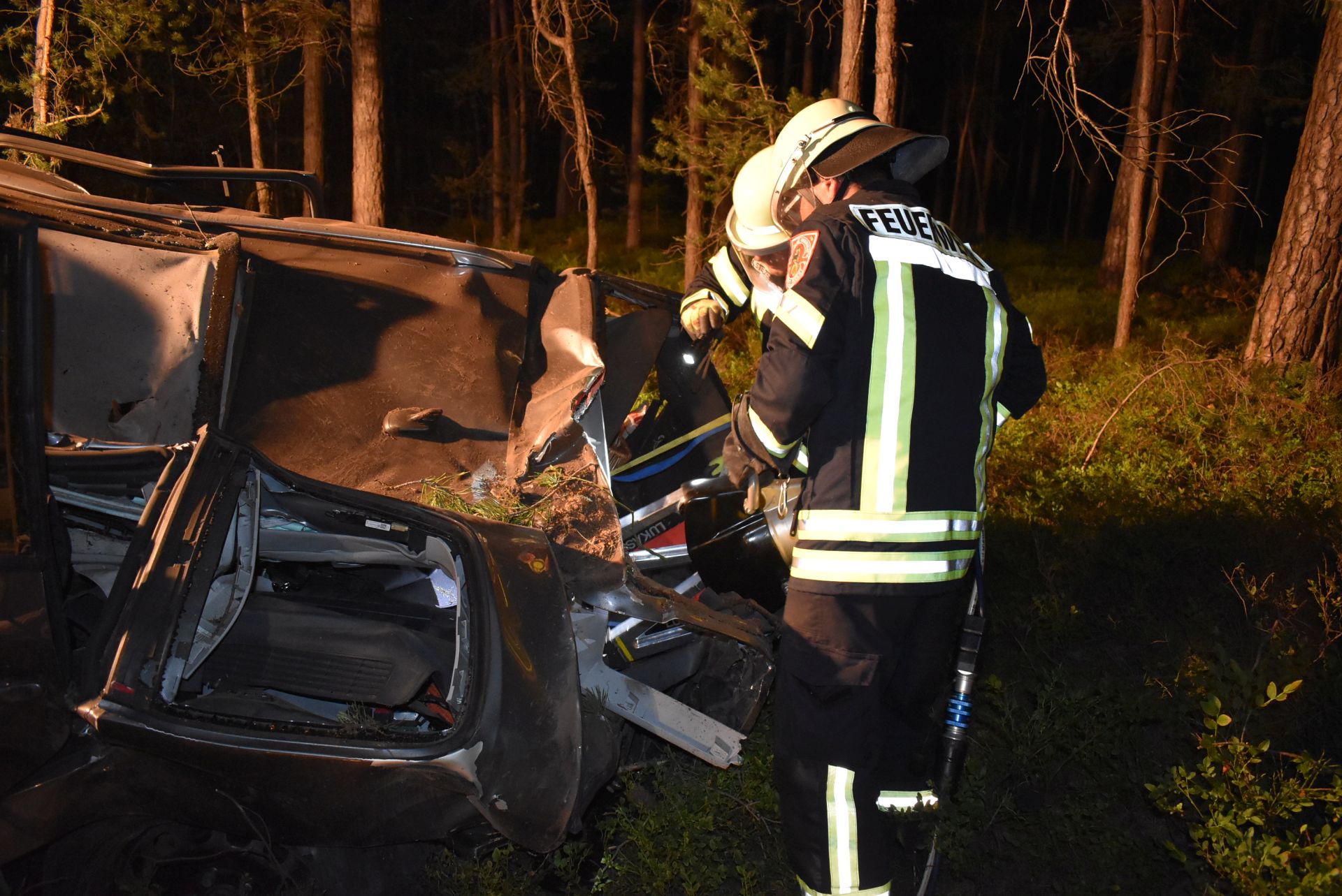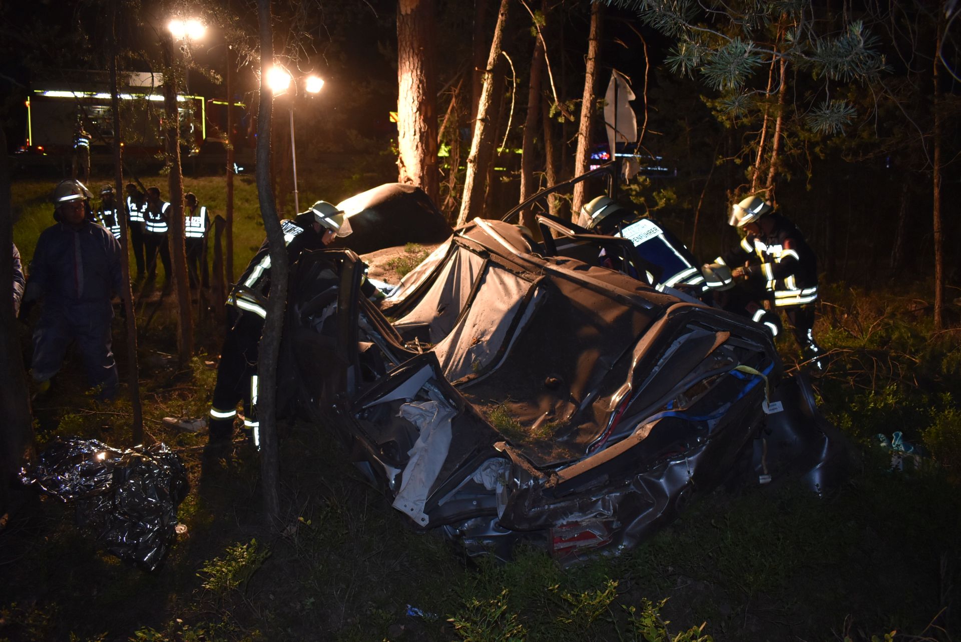 Die Staatsanwaltschaft beorderte einen Gutachter an die Einsatzstelle. Zur Unfallaufnahme wurde diese daher aufgrund der einbrechenden Dunkelheit von der Feuerwehr großflächig ausgeleuchtet. Nach Freigabe durch den Sachverständigen wurde das Fahrzeug mit Rettungsgerät geöffnet und die Leiche geborgen. Für den Abschleppdienst wurden einige kleinere Bäume entfernt. Nach Abtransport des Opfers und des Fahrzeugs konnte der Einsatz nach knapp 4 Stunden beendet werden.