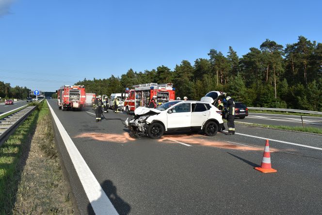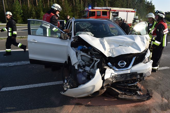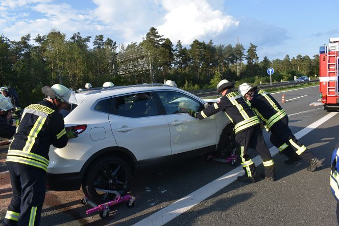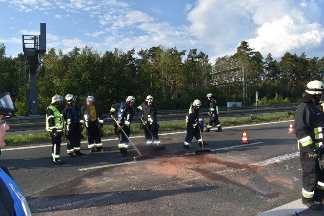 Vermutlich im Rückstau der Reinigungsarbeiten auf der A6 kam es auf Höhe des Autobahnkreuzes Nürnberg Ost zu einer Kollision eines PKW mit einem Kleintransporter. Da die Örtlichkeit der Unfallstelle aufgrund widersprüchlicher Anrufermeldungen zunächst unklar war, wurden zeitgleich wieder die Feuerwehren Feucht, Fischbach und Nürnberg alarmiert. Bei dem Unfall wurden insgesamt 4 Personen leicht verletzt und mussten vom Rettungsdienst versorgt werden. An der Einsatzstelle landete auch ein Rettungshubschrauber. Aufgrund des Zusammenstoßes musste die Richtungsfahrbahn der A6 komplett gesperrt werden. Die Einsatzkräfte unterstützten den Rettungsdienst bei der Versorgung der Verletzten und nahmen ausgelaufene Betriebsmittel auf. Mit speziellen Radgreifern der Feuerwehr Feucht konnte der verunfallte PKW schnell von der Fahrbahn gebracht und somit zumindest 1 Fahrspur wieder freigegeben werden.