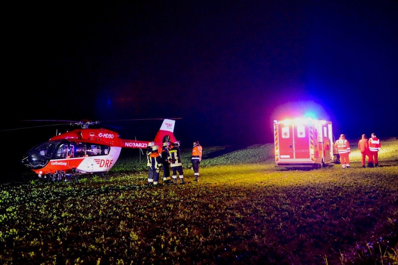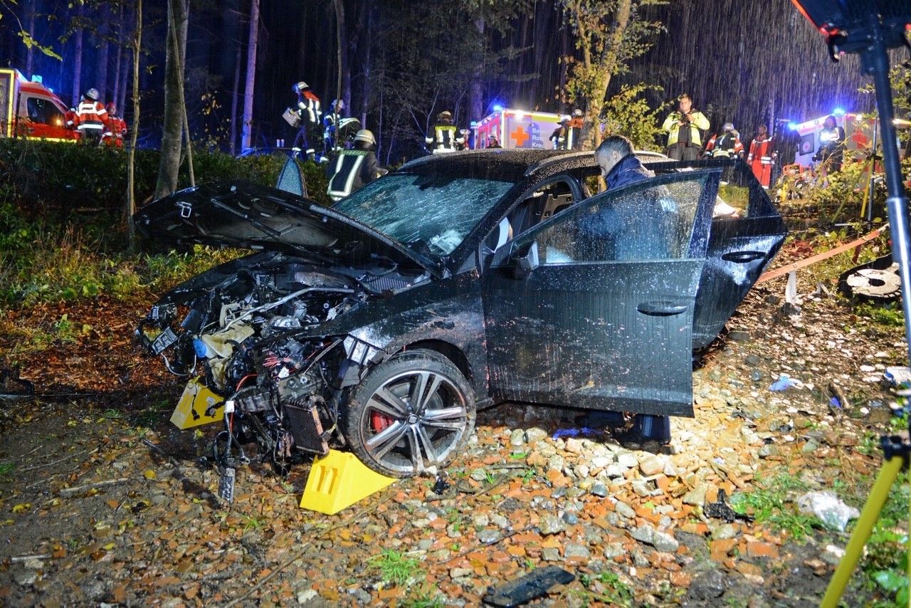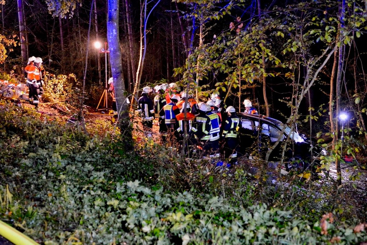 Beim Eintreffen der ersten Einsatzkräfte bot sich folgende Lage.: Ein Seat-PKW kollidierte auf der Verbindungsstraße Burgthann und Schwarzenbach mit einem Wildschwein. Daraufhin verlor der Fahrer wohl die Kontrolle über sein Fahrzeug und krachte frontal gegen einen Baum und rutschte eine Böschung hinab. Durch die Wucht des Aufpralls wurde die Front des Fahrzeuges komplett deformiert. Ein Ersthelfer hatte den Beifahrer bereits aus dem Auto befreit. Trotz sofortiger Reanimationsmaßnahmen durch den Ersthelfer und den Rettungsdienst kam für den 33-Jährigen jede Hilfe zu spät. Er verstarb noch an der Unfallstelle. Der PKW-Fahrer war im Fußbereich schwer eingeklemmt und nur bedingt ansprechbar. Durch die Feuerwehren Ezelsdorf und Burgthann wurde die Einsatzstelle großflächig ausgeleuchtet und auf Weisung hin des Notarztes eine schonende Rettung vorbereitet. Durch die abschüssige Lage musste das Unfallfahrzeug gegen Abrutschen gesichert werden. Mittels hydraulischer Rettungsschere und Spreitzer wurde ein Zugang in den PKW geschaffen und die schwerverletzte Person über den Kofferraum aus dem Fahrzeug befreit und an den Rettungsdienst übergeben. Parallel wurde durch die Feuerwehr Schwarzenbach und den GW Logistik aus Ezelsdorf ein Landeplatz für den alarmierten Rettungshubschrauber Christoph Nürnberg ausgeleuchtet. Auf Anordnung der Staatsanwaltschaft wurde zur Klärung ein Sachverständiger an die Einsatzstelle gerufen. Nachdem der Seat-PKW aus dem Wald geborgen wurde, musste die Unfallstelle noch von einer Fachfirma gereinigt werden. Für die gesamte Dauer der Rettung und Gutachtertätigkeit war die Staatsstraße total gesperrt. Nach 4,5 Stunden konnten die letzten Kräfte wieder einrücken und die Einsatzbereitschaft wiederherstellen.