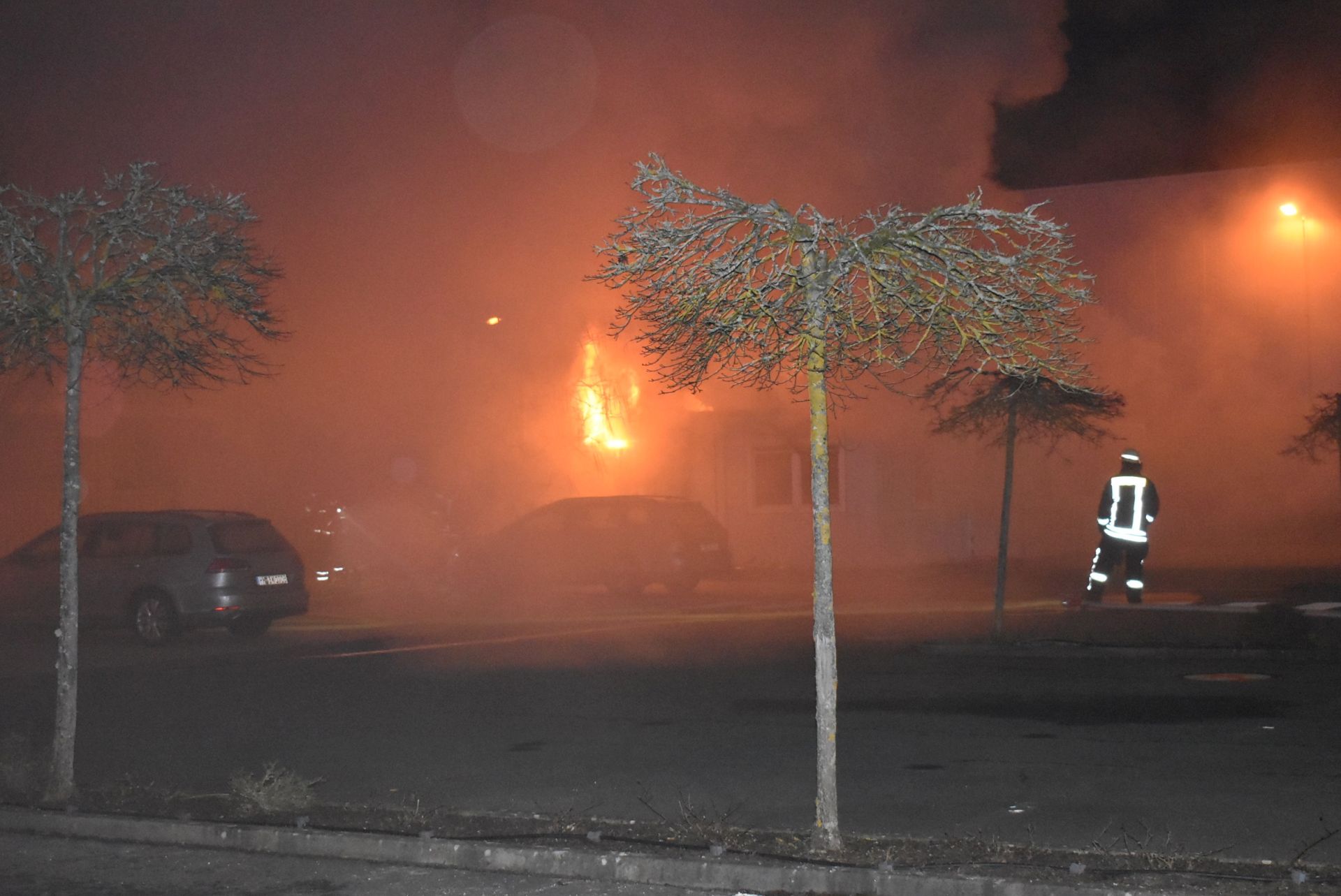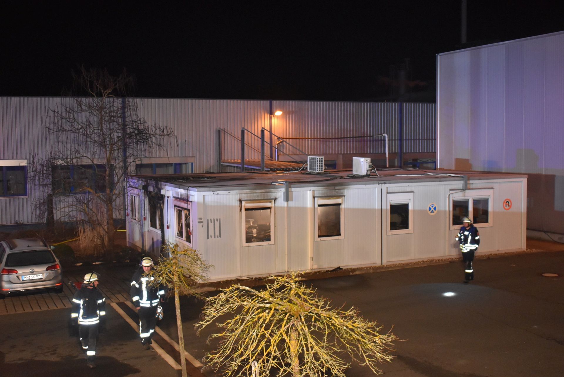 Beim Eintreffen des ersten Löschgruppenfahrzeuges zeigte sich, dass aus einem Fenster von mehreren aneinandergestellten Bürocontainern im Vorbereich der Firma bereits Flammen schlugen. Die kompletten Container waren in eine dichte Rauchwolke gehüllt.