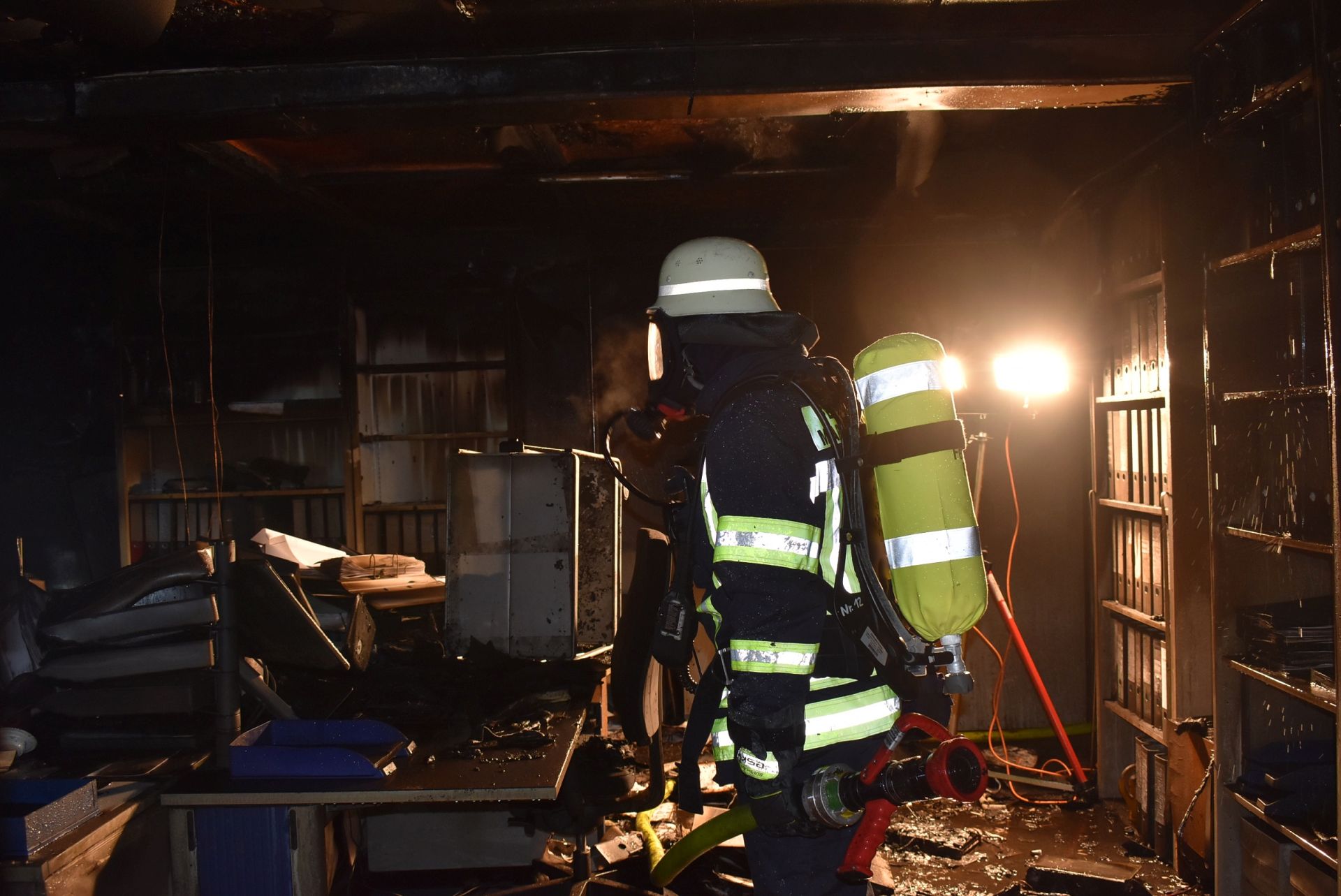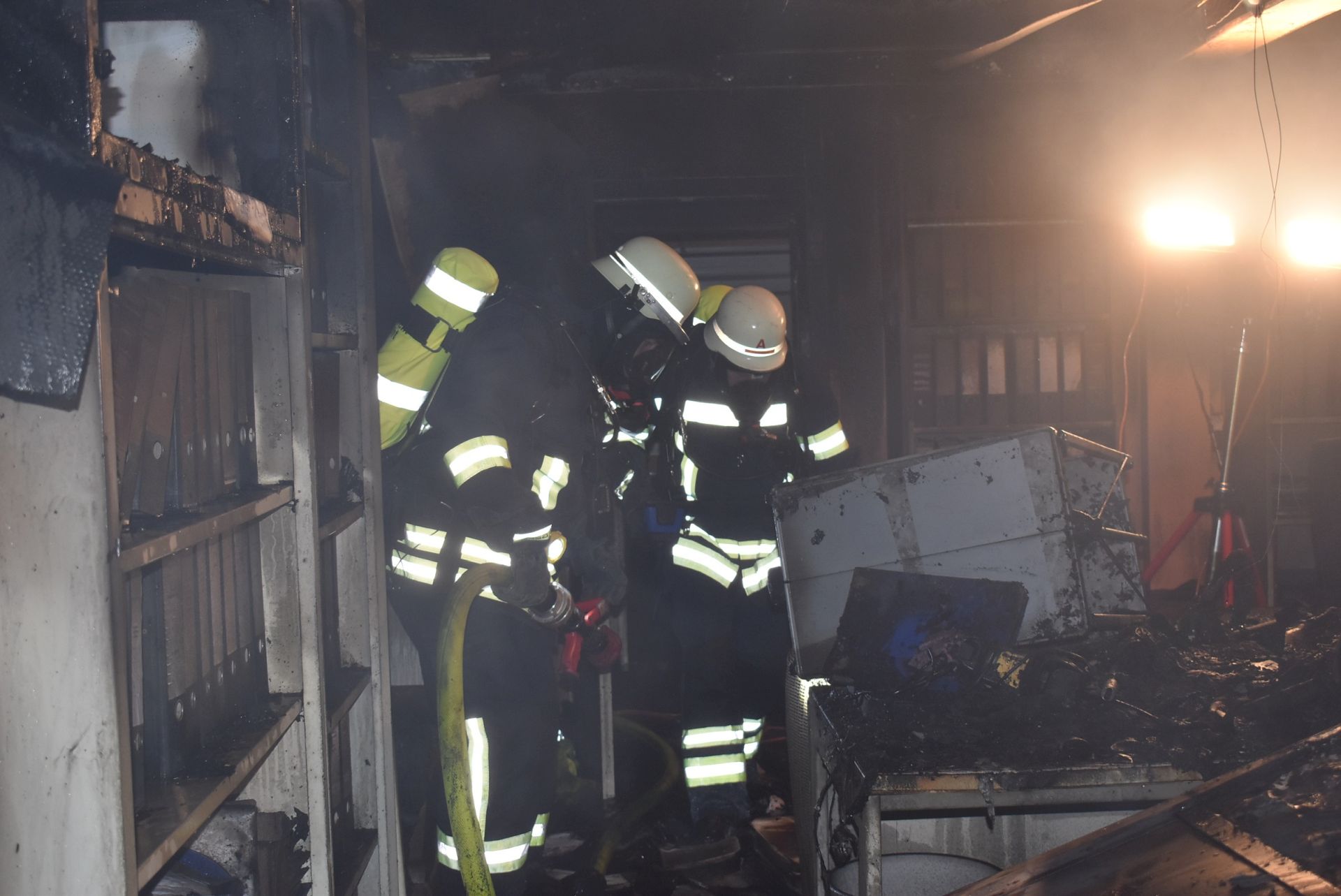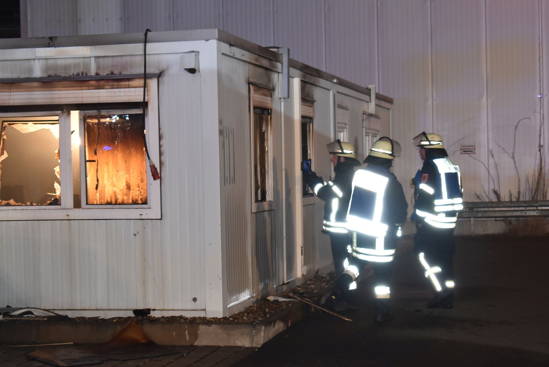 Unter der Leitung des Gruppenführers des LF 16/12 wurde mit dem Löschangriff begonnen. Ein Trupp unter schwerem Atemschutz bekämpfte die Flammen durch das zerplatzte Fenster. Währenddessen öffnete ein zweiter Atemschutztrupp die Eingangstür zu den Containern. Vor der Tür wurden zwei Hochleistungslüfter in Stellung gebracht und beide Trupps drangen daraufhin in die Container ein und konnten das Feuer komplett ablöschen. Zum gezielten Auffinden von Glutnestern leistete die Wärmebildkamera wieder einmal sehr gute Dienste.