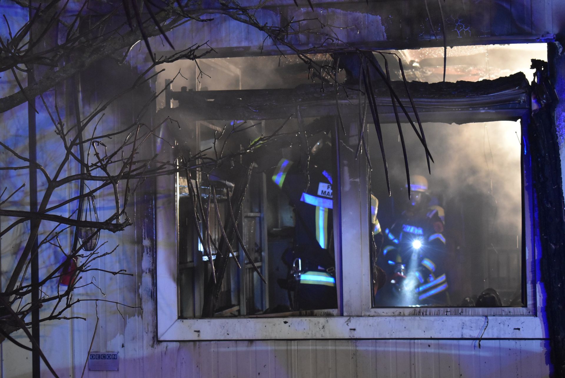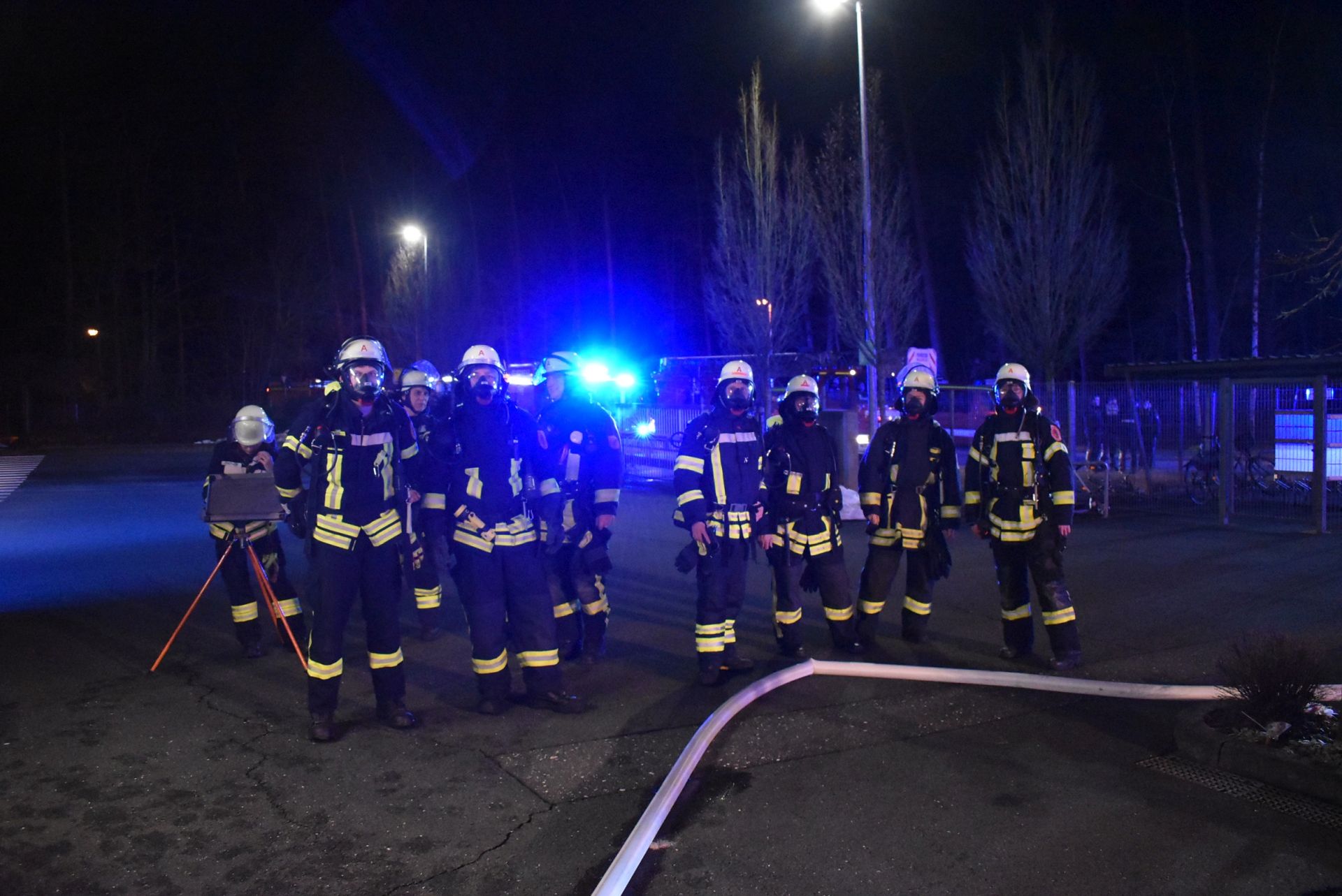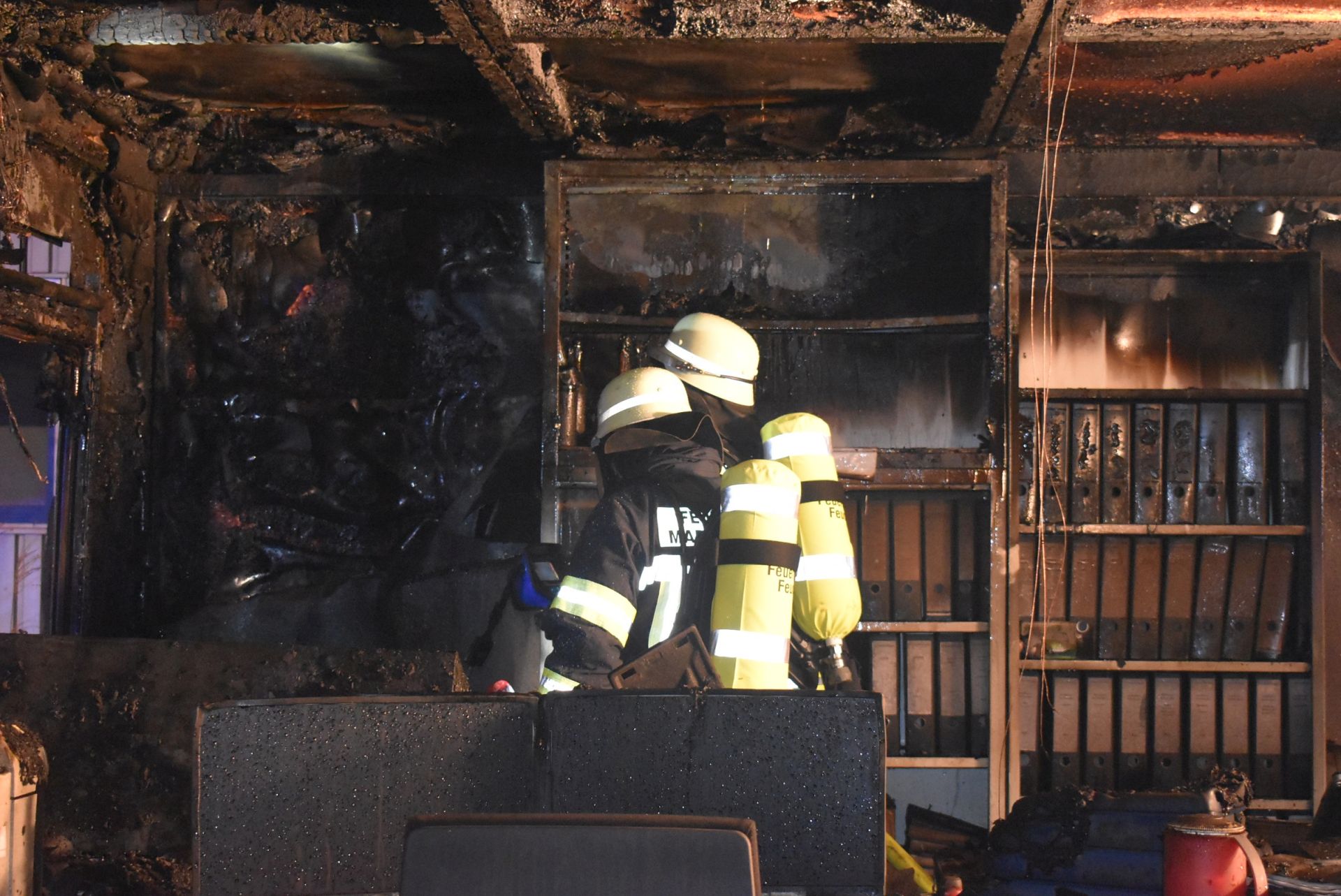 Unter der Leitung des Gruppenführers des LF 16/12 wurde mit dem Löschangriff begonnen. Ein Trupp unter schwerem Atemschutz bekämpfte die Flammen durch das zerplatzte Fenster. Währenddessen öffnete ein zweiter Atemschutztrupp die Eingangstür zu den Containern. Vor der Tür wurden zwei Hochleistungslüfter in Stellung gebracht und beide Trupps drangen daraufhin in die Container ein und konnten das Feuer komplett ablöschen. Zum gezielten Auffinden von Glutnestern leistete die Wärmebildkamera wieder einmal sehr gute Dienste.