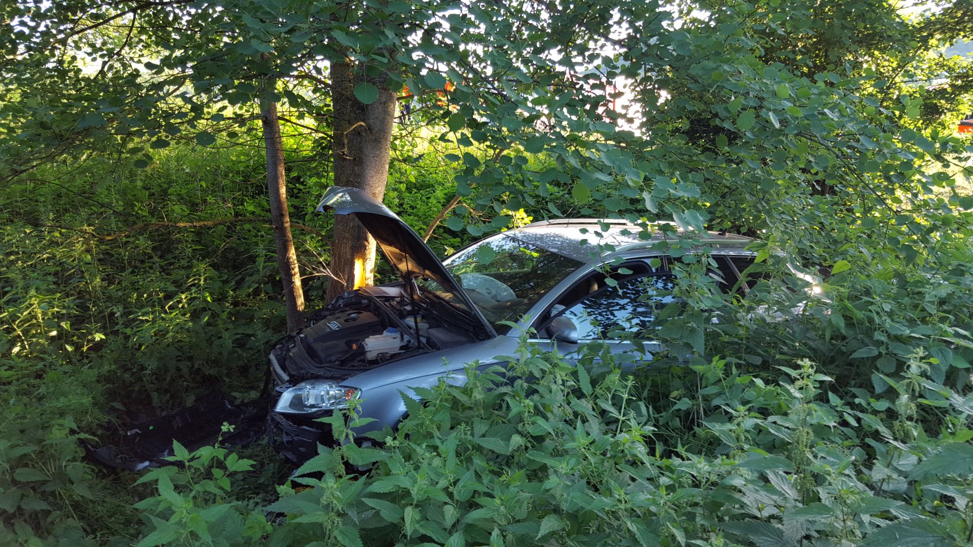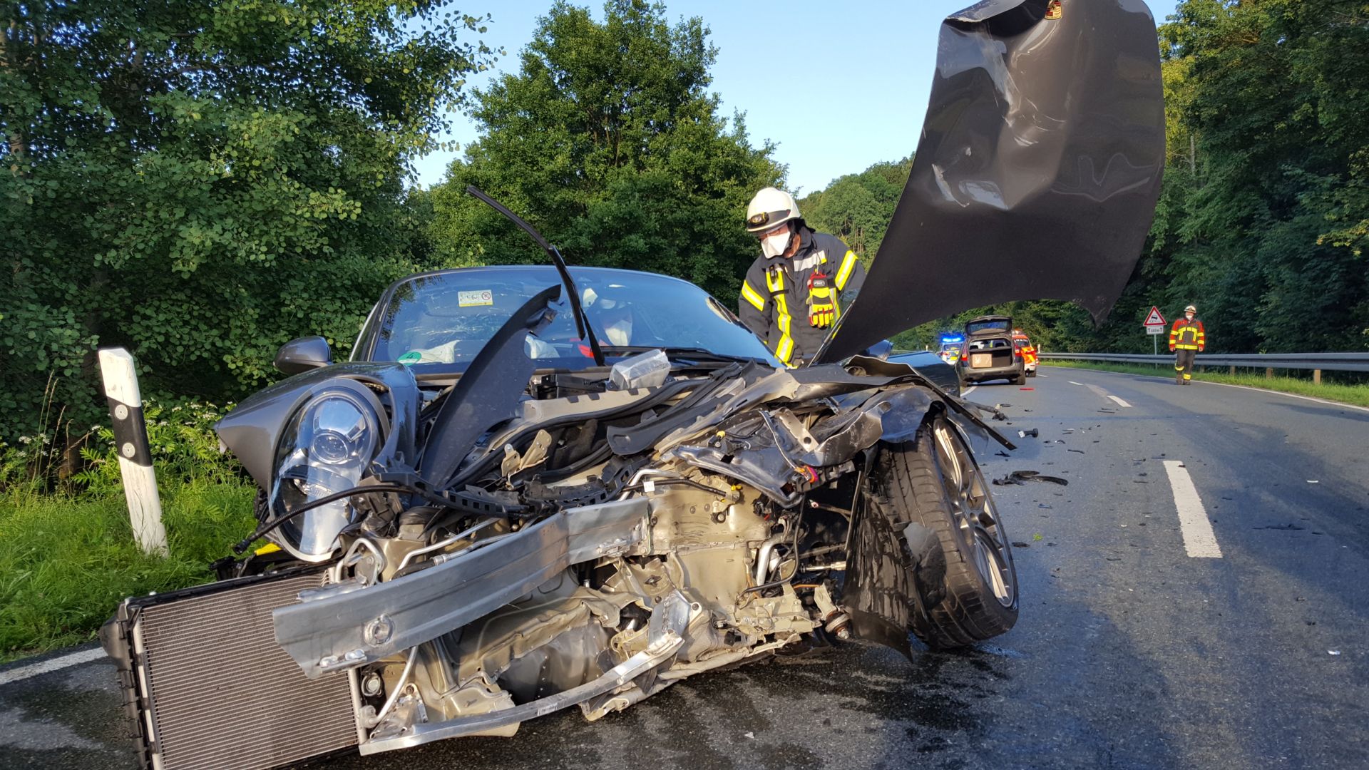Der auf der Staatsstraße fahrende Audi prallte anscheinend mit voller Wucht seitlich gegen die Front des Porsche und wurde anschließend die Böschung hinunter geschleudert. Dadurch war der Audi bei der Ankunft an der Unfallstelle zunächst gar nicht zu sehen. Bis zum Eintreffen der Abschleppwagen stellte die Feuerwehr den Brandschutz sicher und half dann noch beim Aufladen.