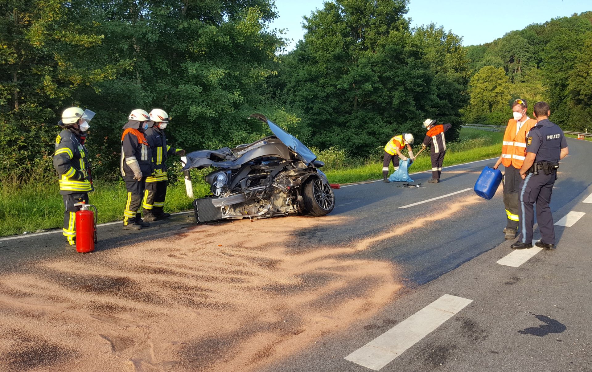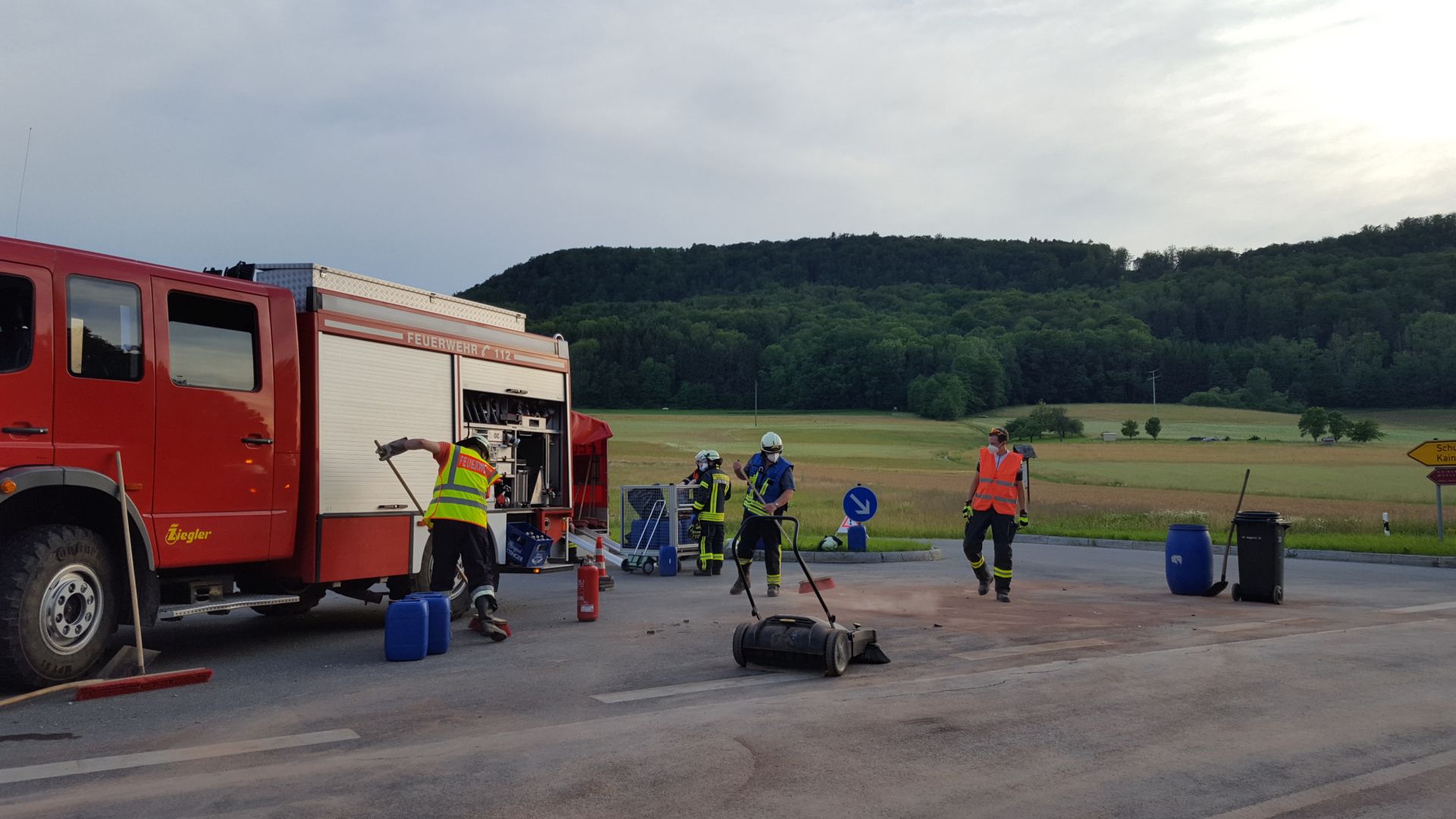 In Zusammenarbeit mit dem zuständigen staatlichen Bauamt wurde entschieden die Straße aufgrund der starken Verunreinigungen mit einem „speziellen Kehrfahrzeug“ gründlich reinigen zu lassen. Nur so konnte sichergestellt werden, dass keine weiteren Verkehrsteilnehmer aufgrund der evtl. „schmierigen“ Fahrbahn zu Schaden kommen.