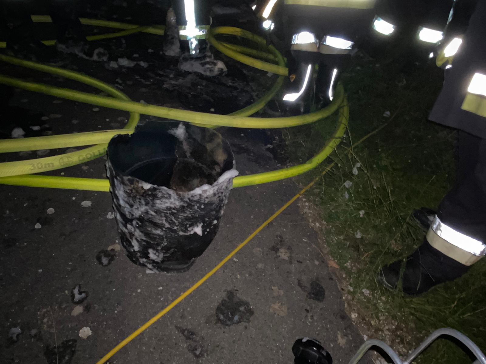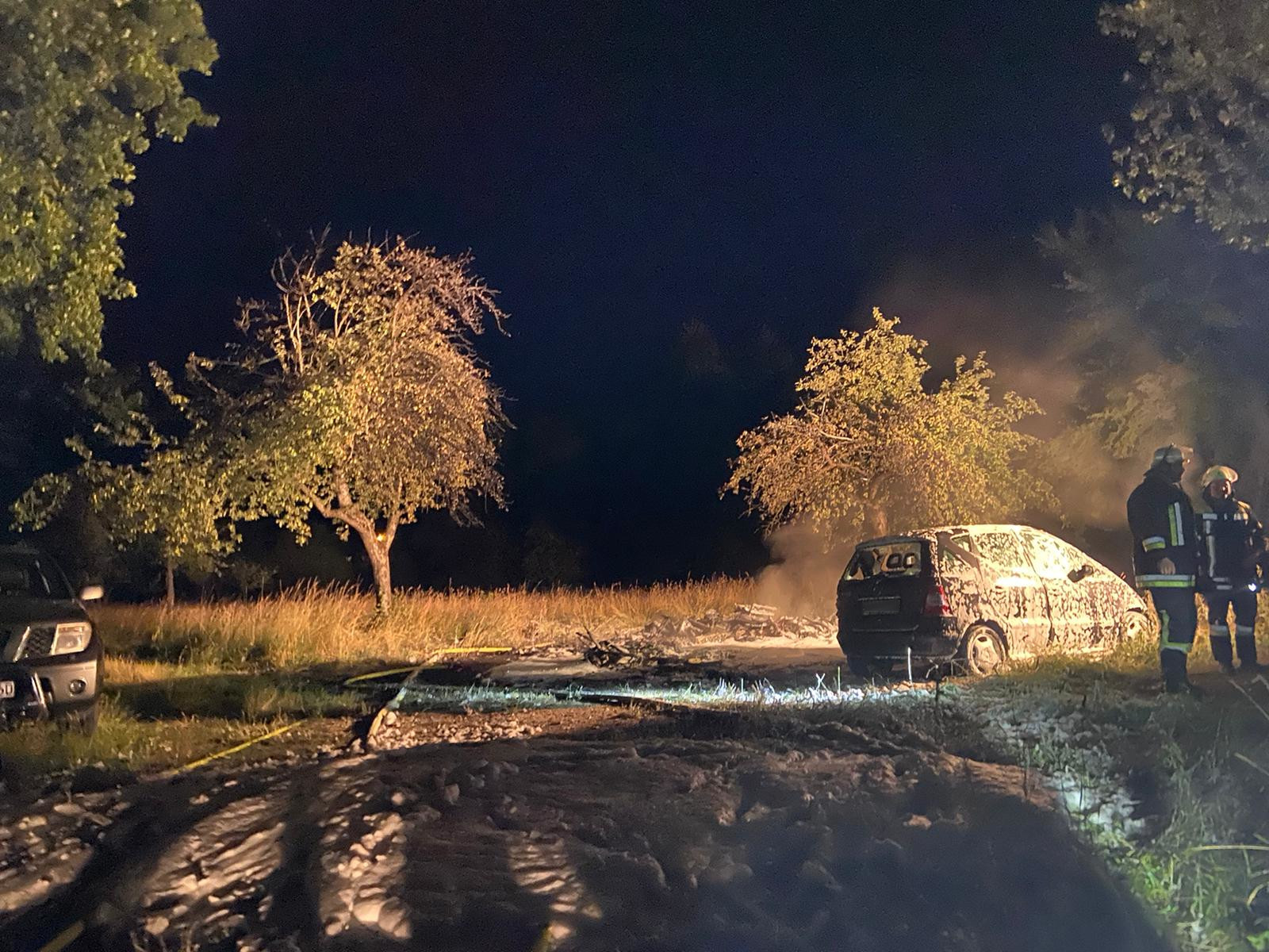 Vor Ort zeigte sich dann ein anderes Bild. Auf einer Wiese oberhalb der Oberndorfer Straße ("Schätzlersgarten") stand ein dort abgestellter Wohnwagen im Vollbrand. Ein daneben geparkter Mercedes brannte bereits. Die beiden Fahrzeuge standen in hohem Gras, umgeben von Bäumen in direkter Nähe zu einem Wohnhaus. Während des Aufbaus der Wasserversorgung ging der Angriffstrupp mit einem C-Rohr an die Brandstelle vor. In diesem Moment explodierte eine Gasflasche, die wohl im Wohnwagen gelagert war. Der Knall der Explosion dürfte im Ortsgebiet gut zu hören gewesen sein.