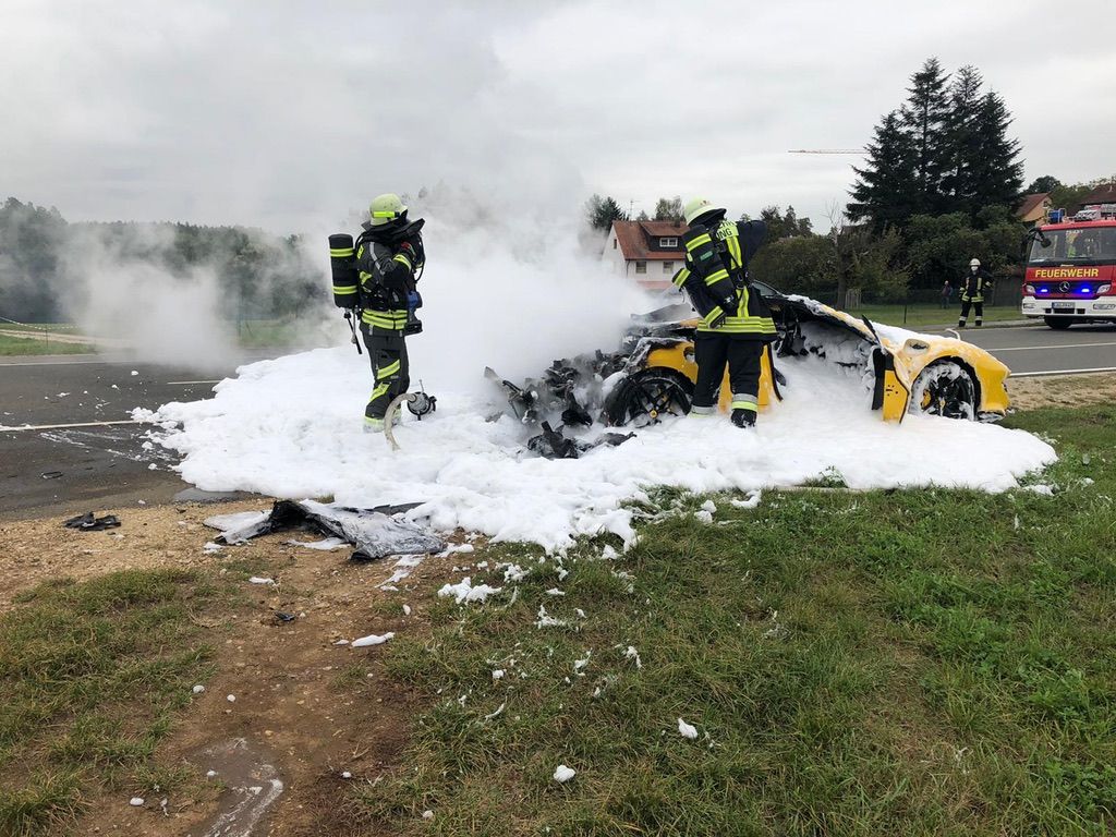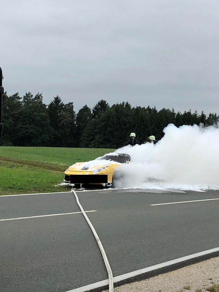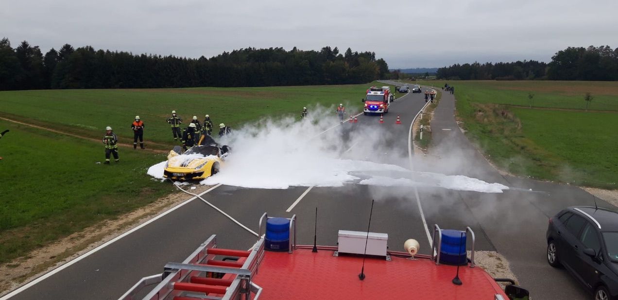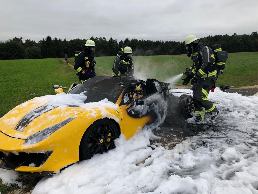 Kuhnhof (DB2) - Zum Brand eines Ferrari kam es am 03. Oktober 2020 bei Lauf a. d. Pegnitz. Im Einsatz waren die Wehren aus Heuchling, Dehnberg und Simonshofen.
