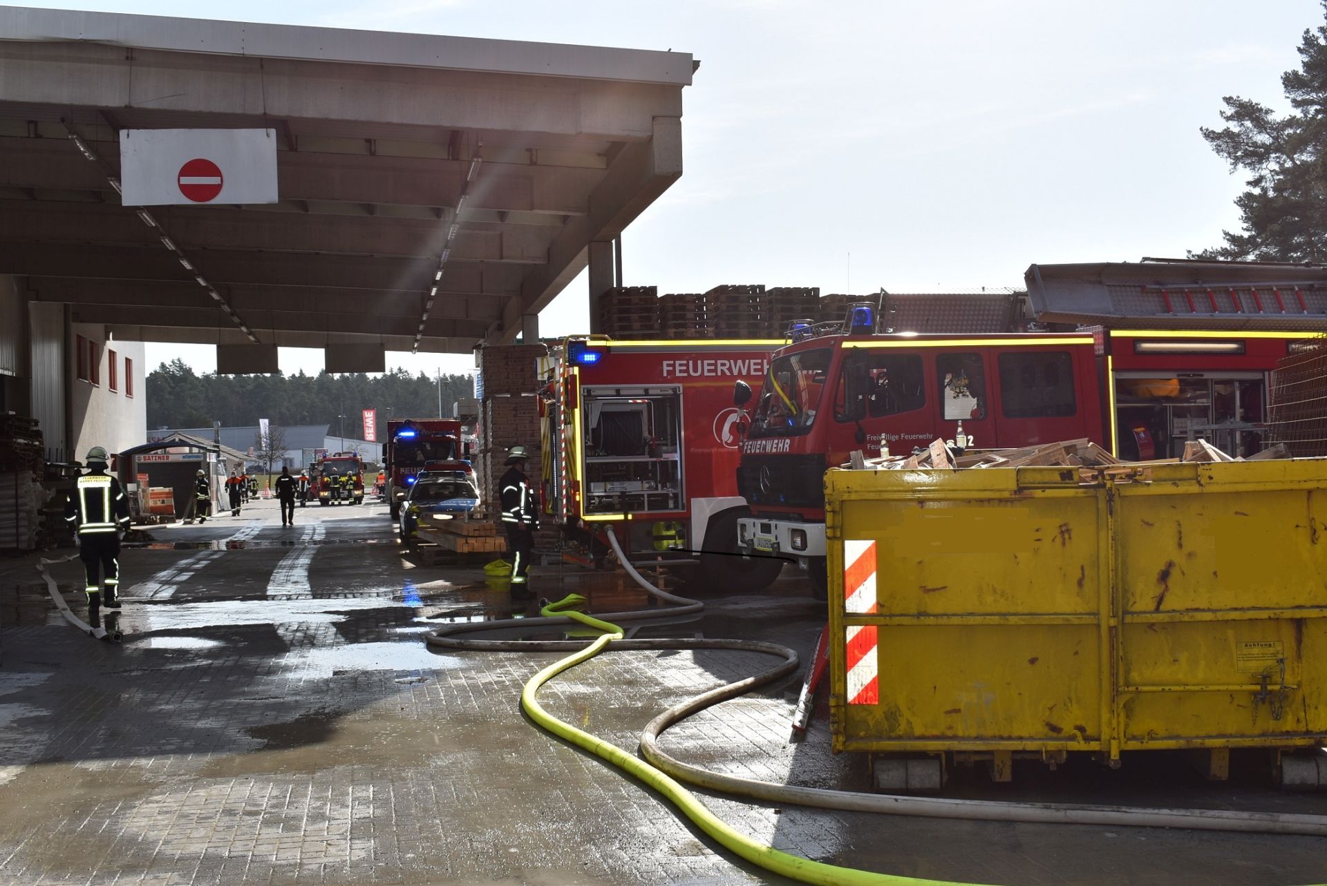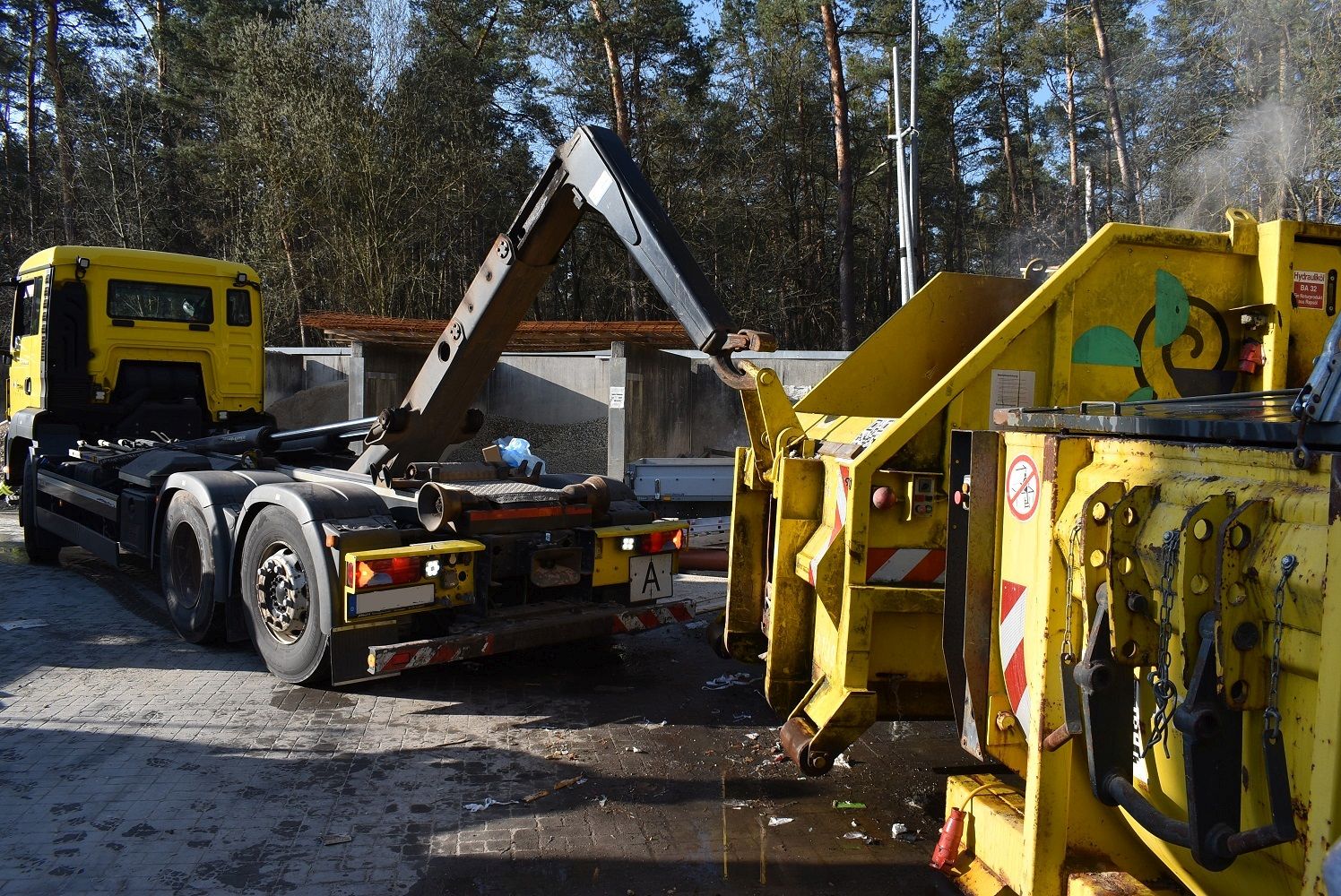 In Zusammenarbeit mit dem Verantwortlichen des Baumarkts gelang es, telefonisch die Entsorgungsfirma des Containers zu erreichen, welche umgehend ein geeignetes Ladefahrzeug schickte. Dieses konnte nach seinem Eintreffen den Container aufnehmen, umsetzen und durch gezieltes Kippen entleeren.