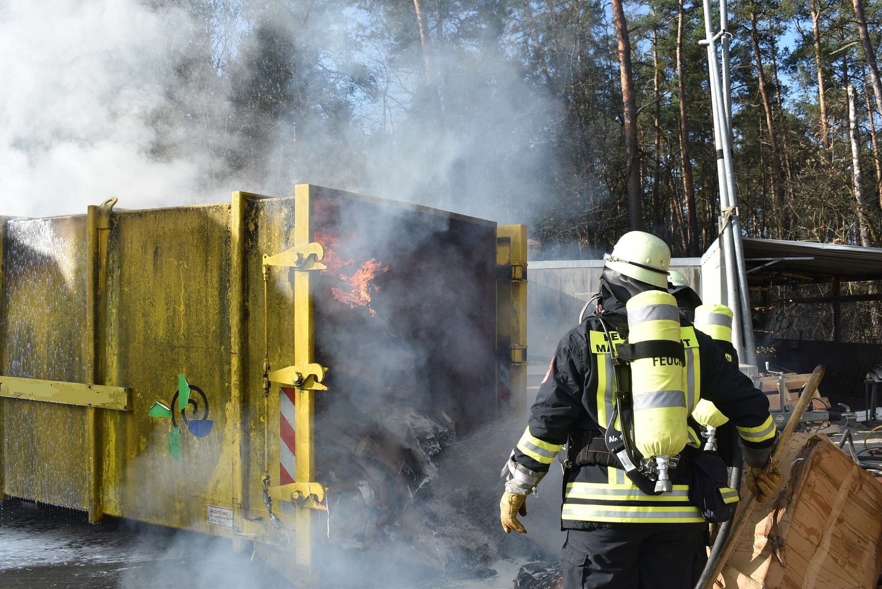 In einem ersten Schritt wurde der Container über die Einlassöffnung mit Wasser geflutet, welchem zum besseren Eindringen Netzmittel zugesetzt wurde. Außerdem wurde die bereits stark erhitzte und sich verbiegende Außenhaut des Container gekühlt. Allerdings stellte sich die Problematik dar, dass der Container selbst aufgrund der Position an einem Zaun nicht geöffnet werden konnte.