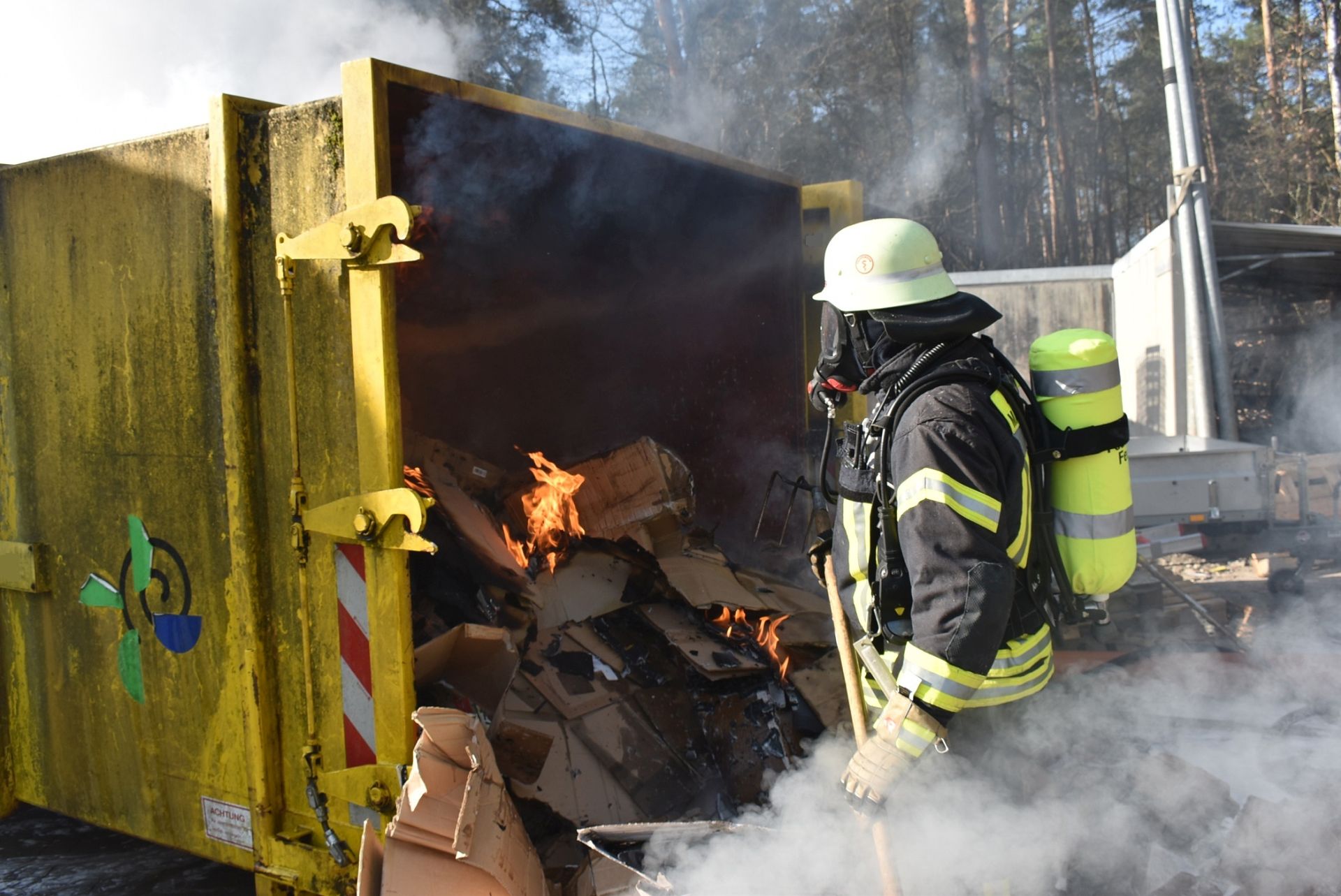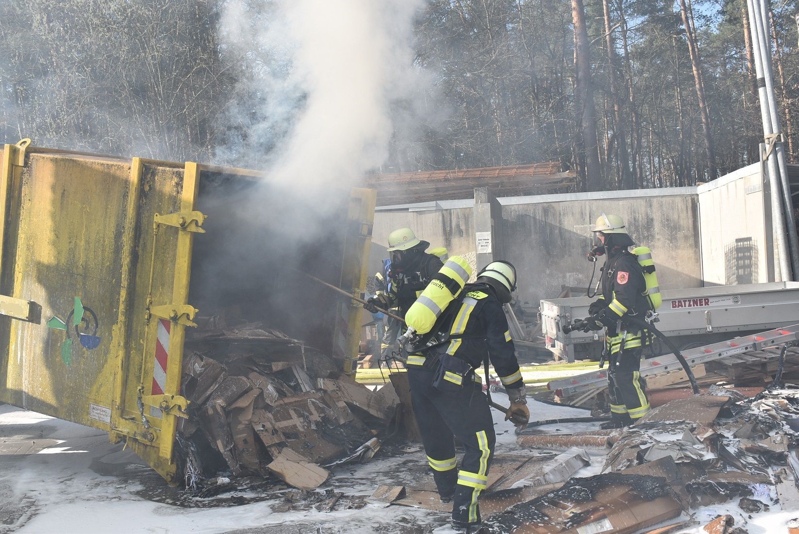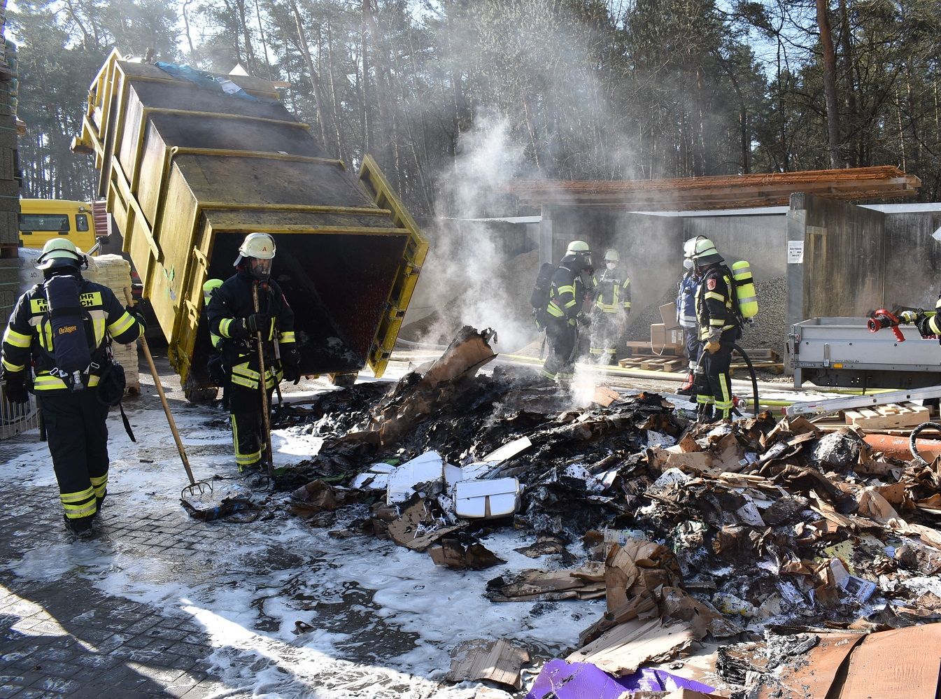 Aufgrund der großen Menge stark gepressten Papiers, welches nun in schweißtreibender Arbeit per Hand auseinander gezogen und abgelöscht werden musste, ließ der Einsatzleiter die Feuerwehr Moosbach mit weiteren Atemschutzgeräteträgern nachalarmieren. Zum Schluss wurde das Brandgut noch mit einem Netzmittelteppich überzogen und der Entsorgungsfirma zum weiteren Verbleib übergeben.