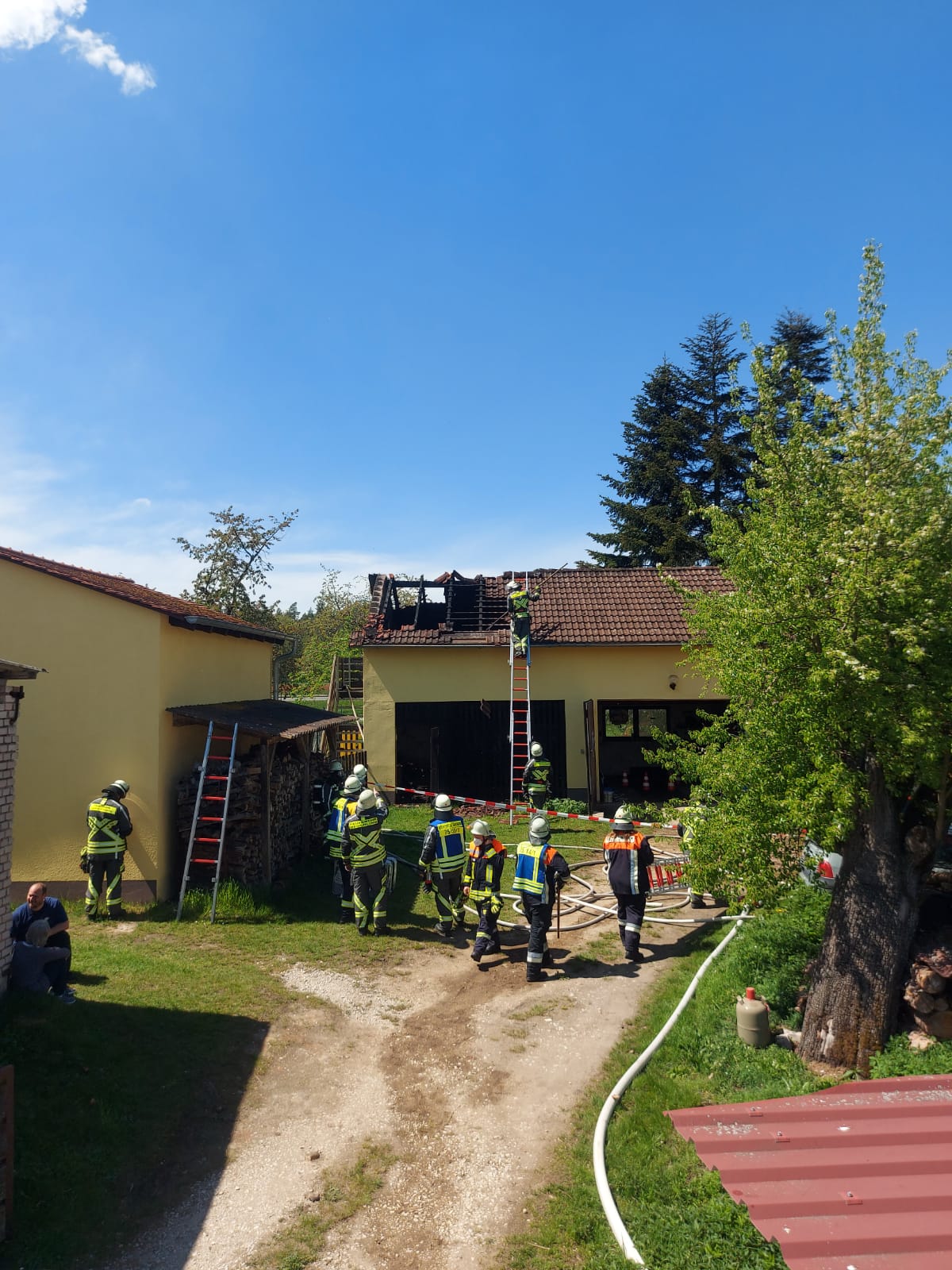 Da durch die enge Zufahrt die Drehleiter aus Lauf nicht eingesetzt werden konnte, musste das Dach über Steckleitern noch weiter geöffnet werden. Aus den Garagen wurden ein Traktor, Gasflaschen und diverse Behälter mit brennbaren Flüssigkeiten ins Freie verbracht.