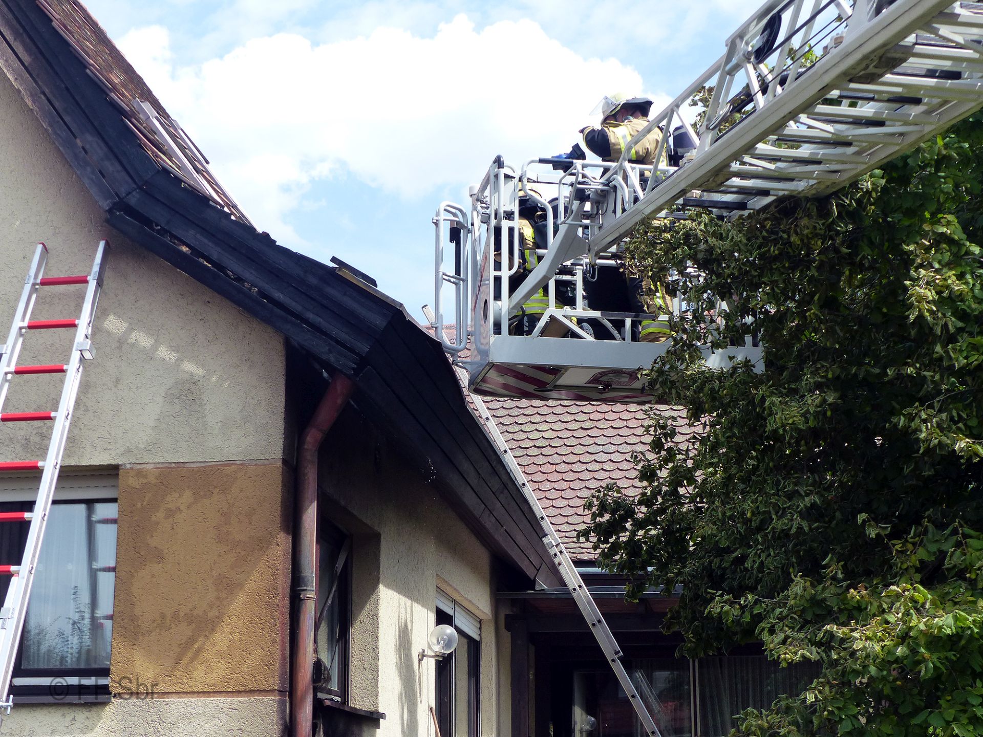 Die eingetroffene Feuerwehr brachte die Drehleiter in Stellung und setzte den Löschangriff mit einem Trupp unter Atemschutz fort.