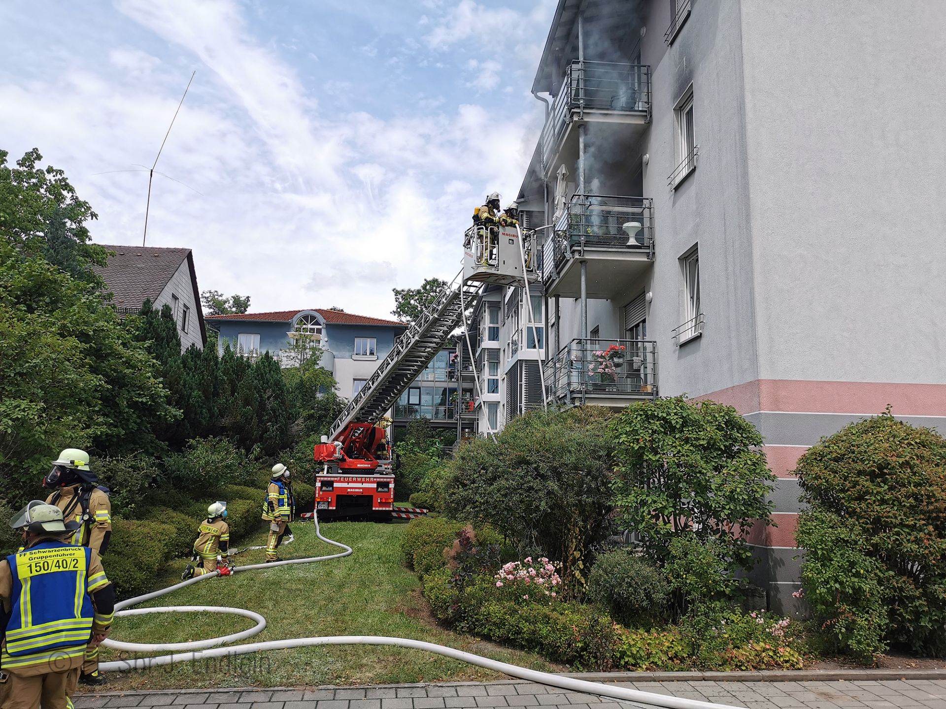 Vor Ort trat bereits Rauch aus mehreren Fenstern im zweiten Obergeschoss aus. Die Einsatzkräfte brachten umgehend die Drehleiter in Stellung, bauten einen Löschangriff auf und erstellten eine Wasserversorgung aus einem nahegelegenen Hydranten. Parallel wurden mehrere Atemschutztrupps im Inneren des Gebäudes eingesetzt um die Bewohner der nahegelegenen Wohnungen zu evakuieren.