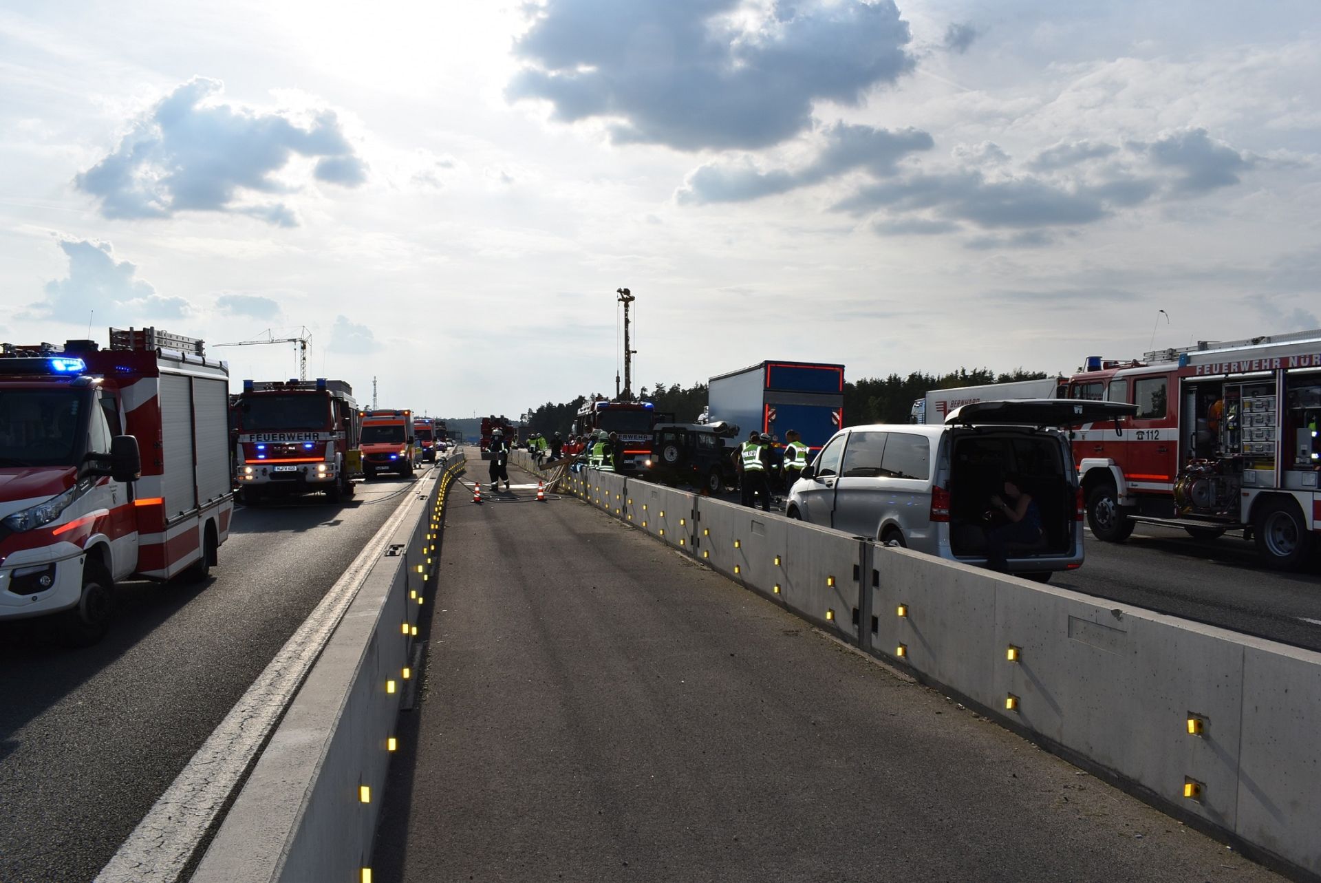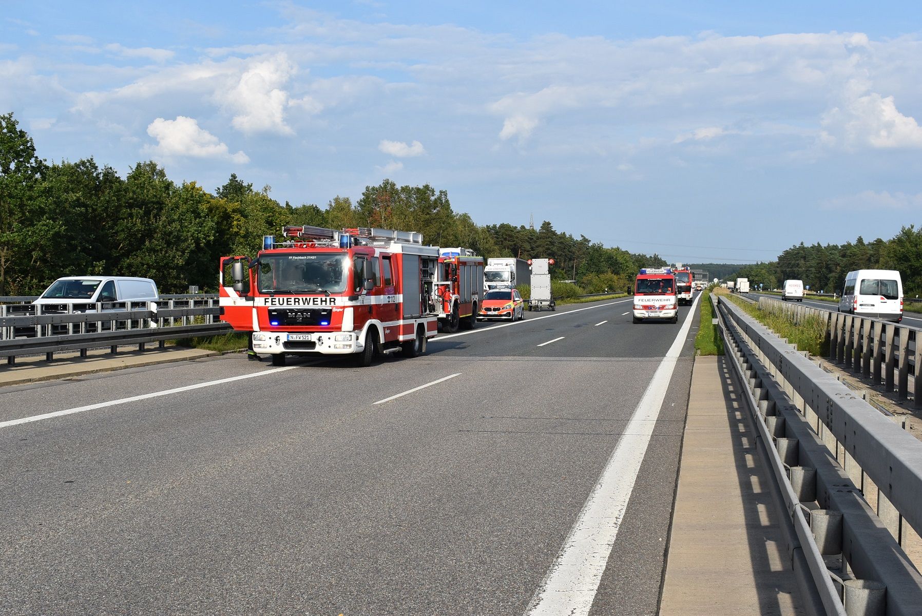 Aufgrund der Baustelle am AK Nbg. Ost gestaltet sich die Anfahrt für alle Kräfte extrem schwierig, da sich die Einsatzstelle fast mittig im Autobahnkreuz befand. Teilweise mussten die Fahrzeuge entgegen der Fahrtrichtung anfahren, teilweise auf der Gegenfahrbahn stehenbleiben.