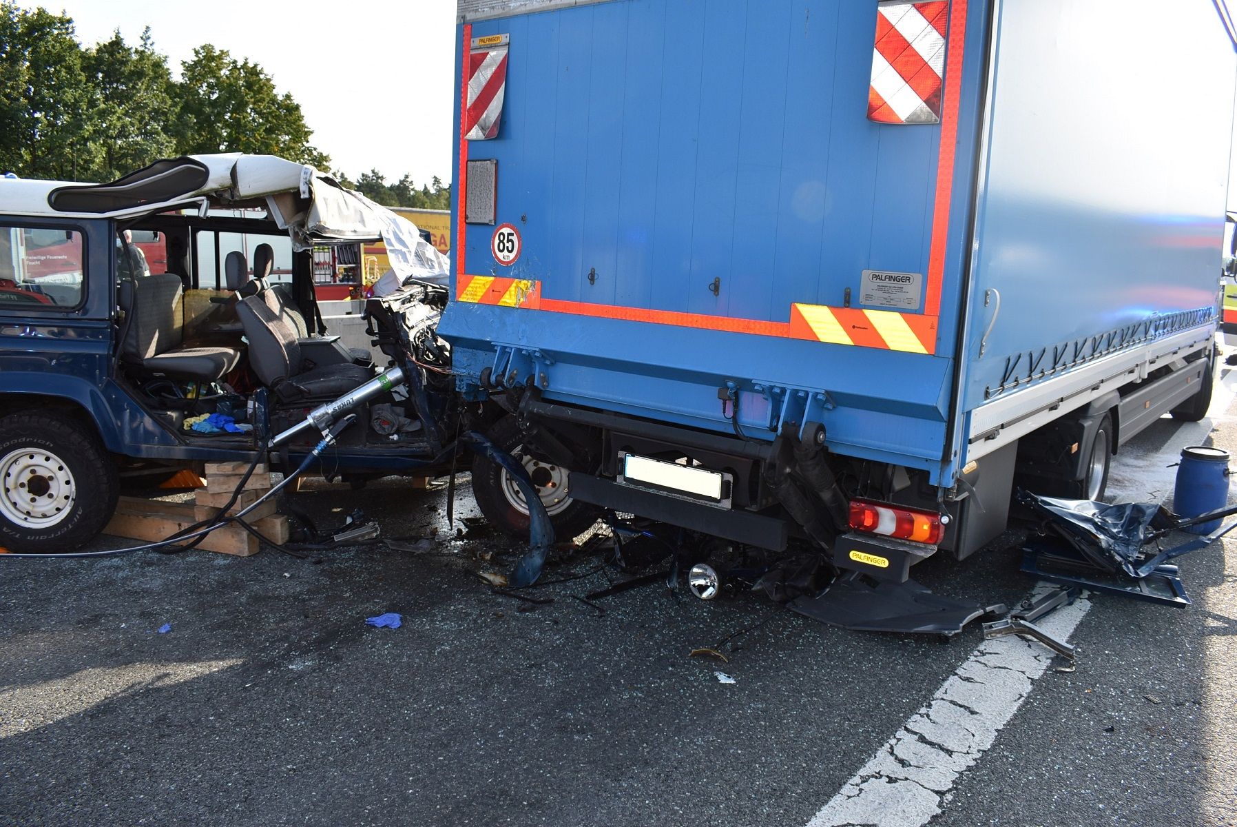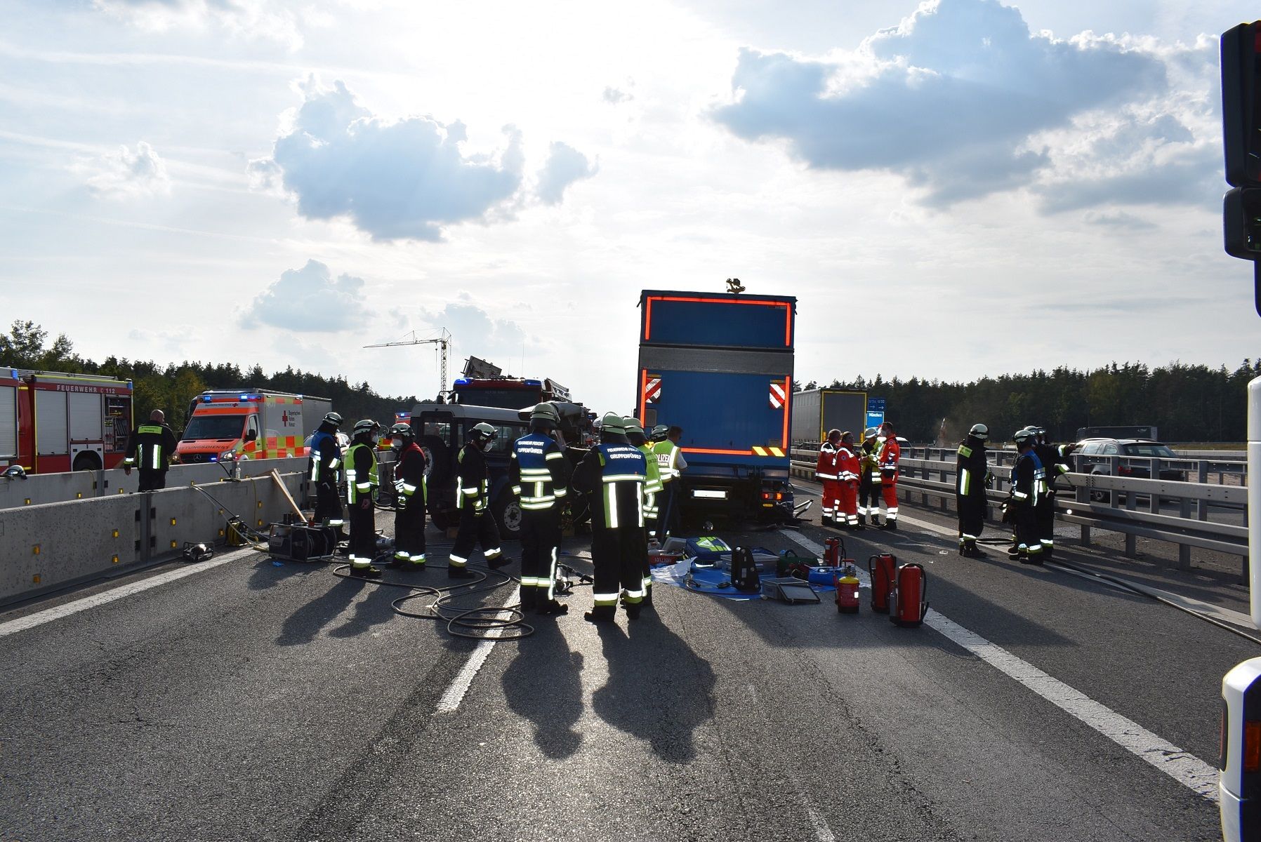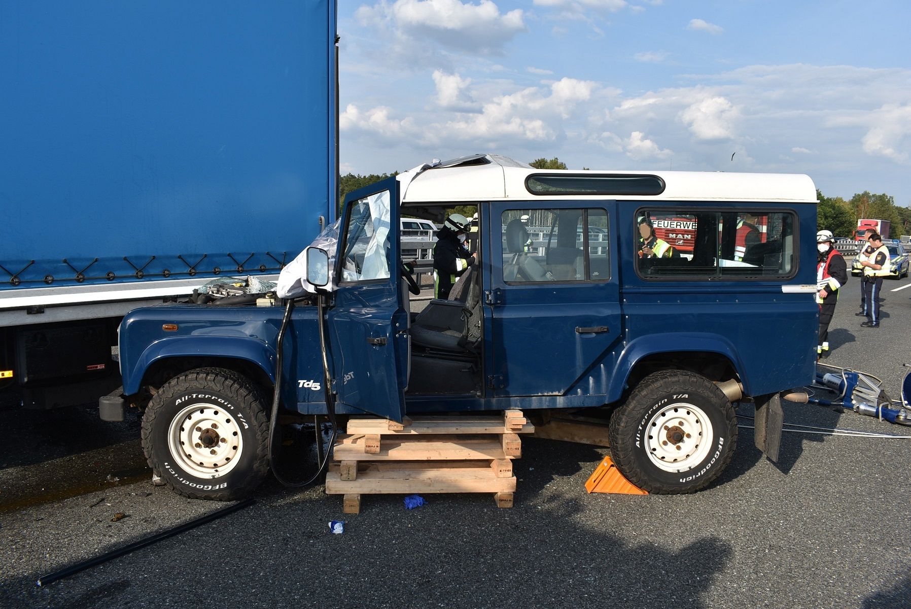 Vor Ort war nach einer Kollision zwischen einem LKW und einem Geländewagen die Beifahrerin des Geländewagens eingeklemmt und konnte sich nicht selbst befreien. Der Fahrer des Geländewagens und der Fahrer des LKW hatten die Fahrzeuge selbst verlassen und waren leicht bzw. mittelschwer verletzt.