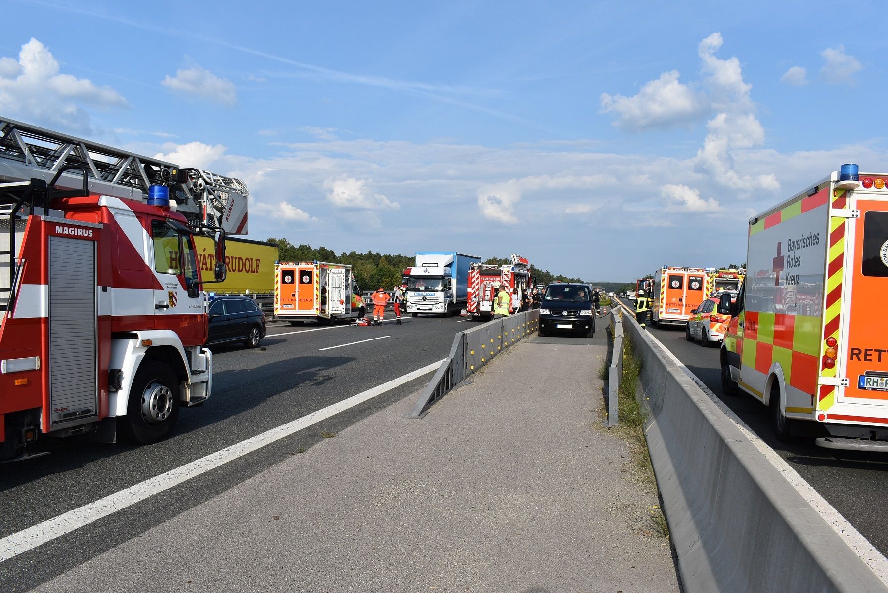 Feucht (DB 3) - Am 07. September 2021 um 16:31 Uhr wurde die Freiwillige Feuerwehr Markt Feucht zu einem Verkehrsunfall zwischen LKW und PKW alarmiert. Gemeinsam mit den Feuchter Kräften machten sich die Berufsfeuerwehr Nürnberg, die Freiwillige Feuerwehr Fischbach, Einheiten des Rettungsdienstes und der Polizei auf den Weg zur Unfallstelle. Diese sollte sich zwischen dem Autobahnkreuz Nürnberg Ost und der Anschlussstelle Langwasser in Fahrtrichtung Heilbronn befinden.