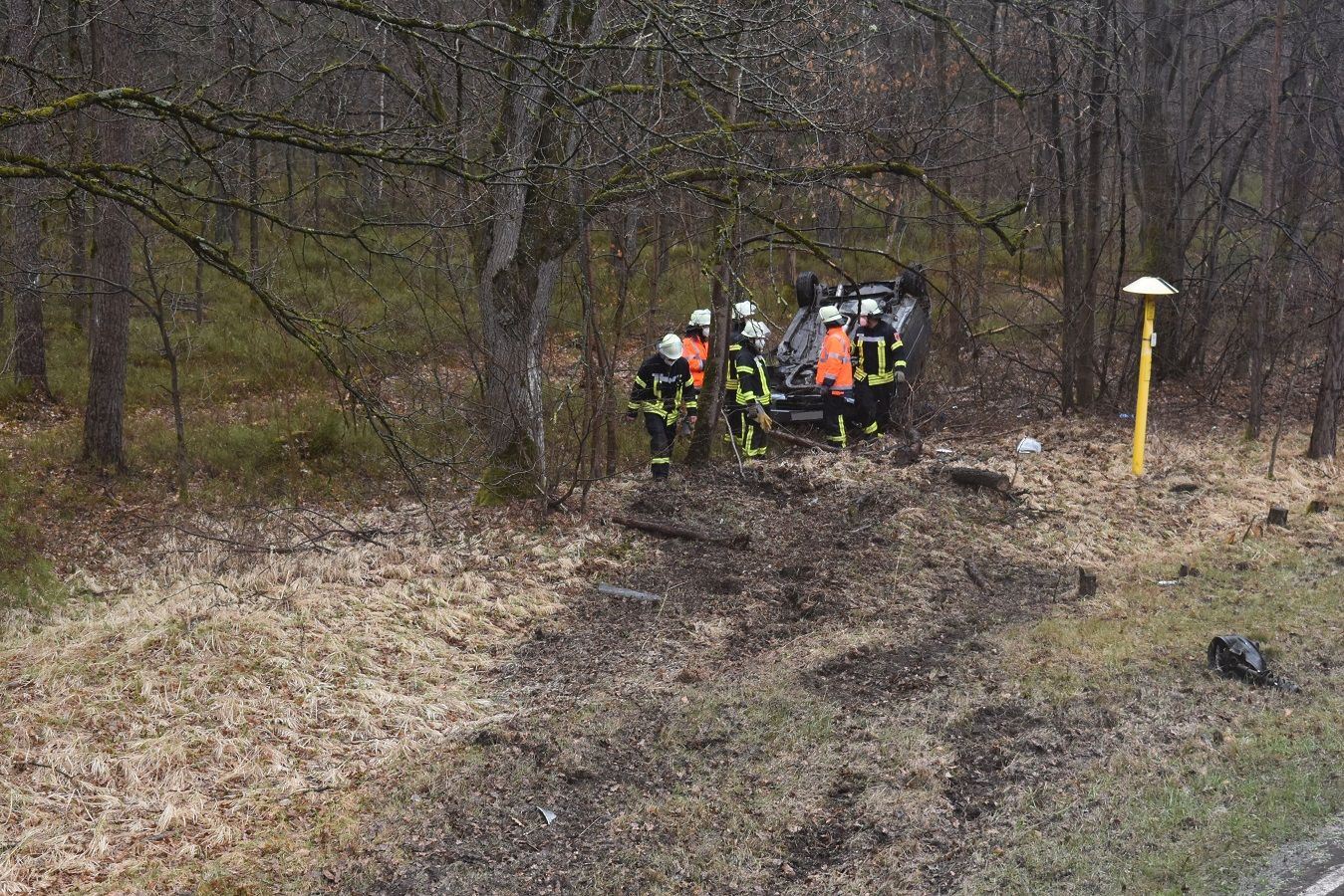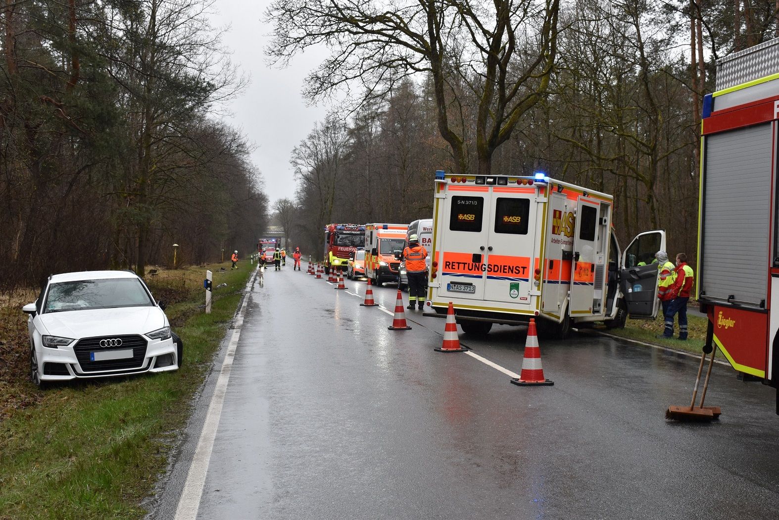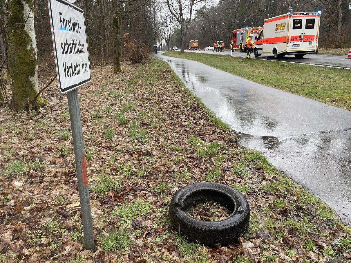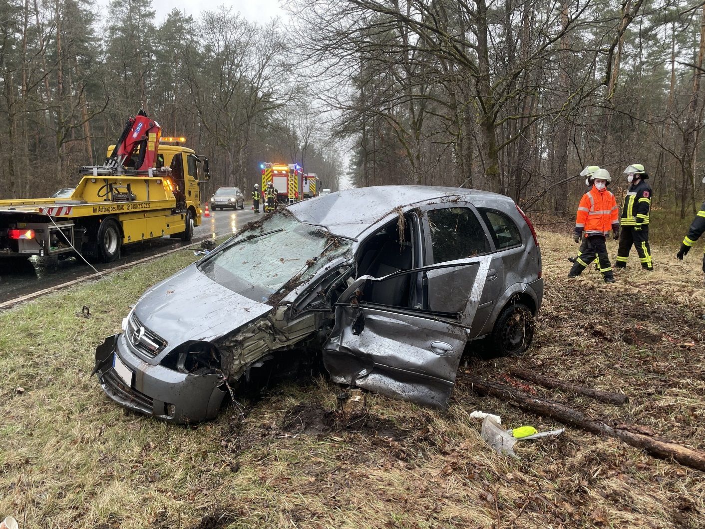 Bei Eintreffen der ersten Einheiten an der Unfallstelle auf der Staatsstraße stand ein PKW beschädigt auf dem Randstreifen, ein weiterer PKW war auf dem Dach einige Meter im angrenzenden Wald zum Liegen gekommen. Personen befanden sich nicht mehr im Fahrzeug, sondern wurden bereits rettungsdienstlich versorgt.