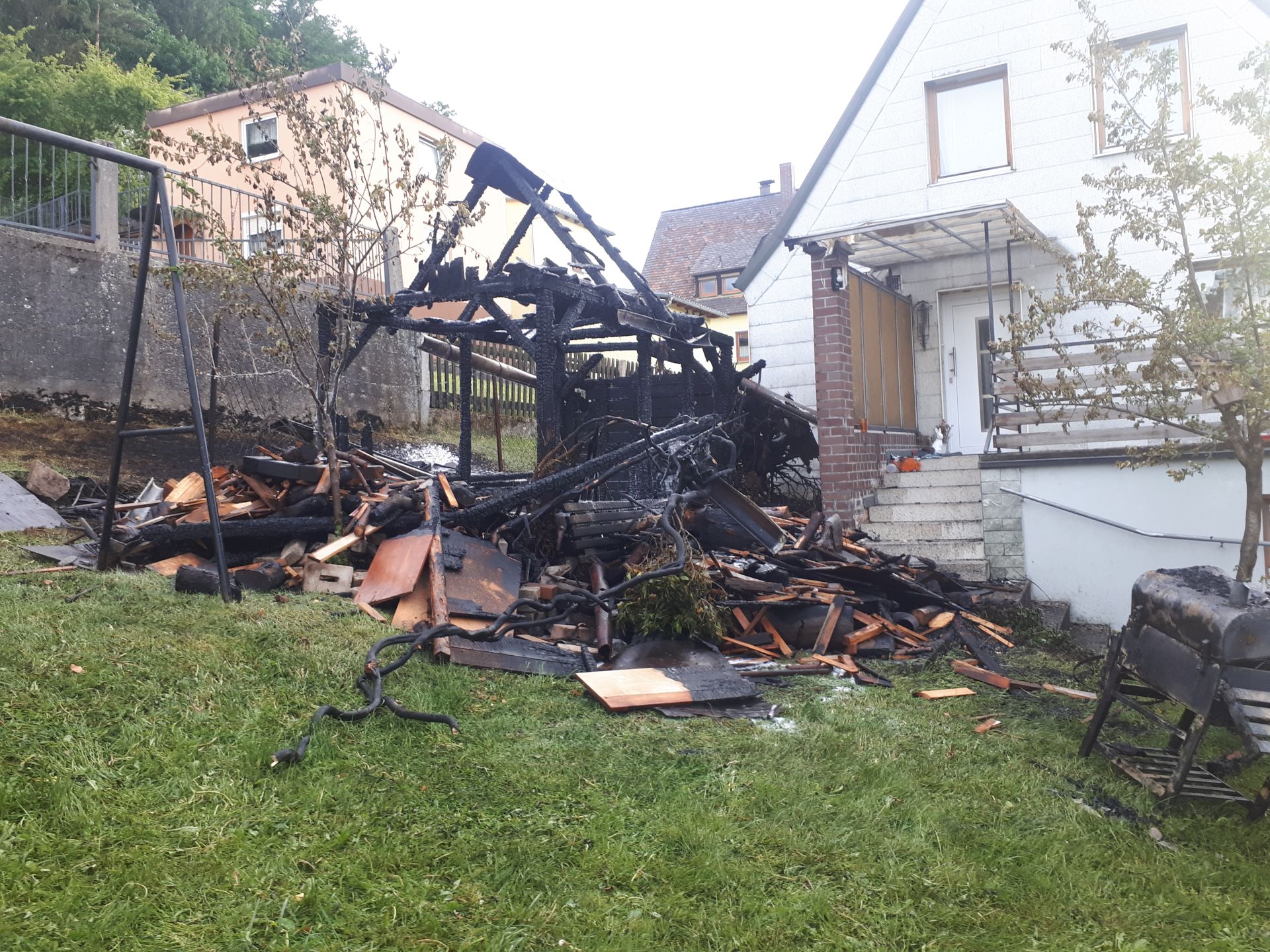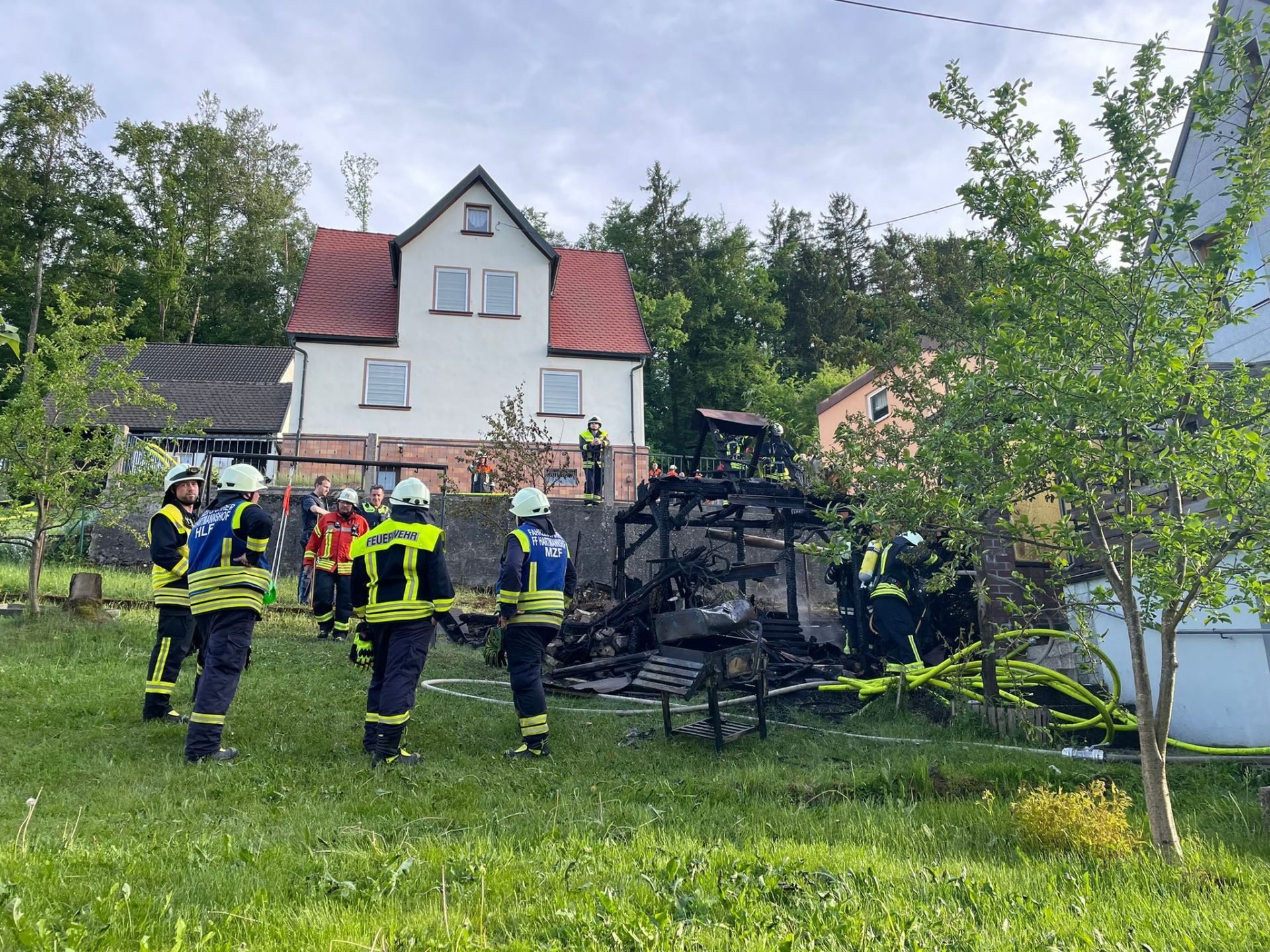 Hartmannshof (DB 1) - Am Abend des 22.Mai wurden um 18.26 Uhr die Feuerwehren Hartmannshof, Weigendorf, Pommelsbrunn, Guntersrieth und Hersbruck zu einer brennenden Gartenhütte am Gebäude alarmiert. Beim Eintreffen der ersten Kräfte stand die Gartenhütte bereits in Vollbrand. Der Abstand zum Wohnhaus betrug nur ca. 1,5m.